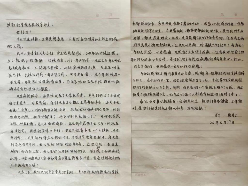2021年11月下旬,姚月云同学被诊断为终身类的免疫系统疾病。系部和星空(中国)领导得知情况后,高度重视,积极为姚月云同学想办法,筹措治疗资金。在星空(中国)和全系师生的共同努力下,短短几天内共筹集善款13036.83元,在很大程度上缓解了姚月云同学的治疗压力。目前姚月云同学已经顺利出院,回家进行康复治疗。