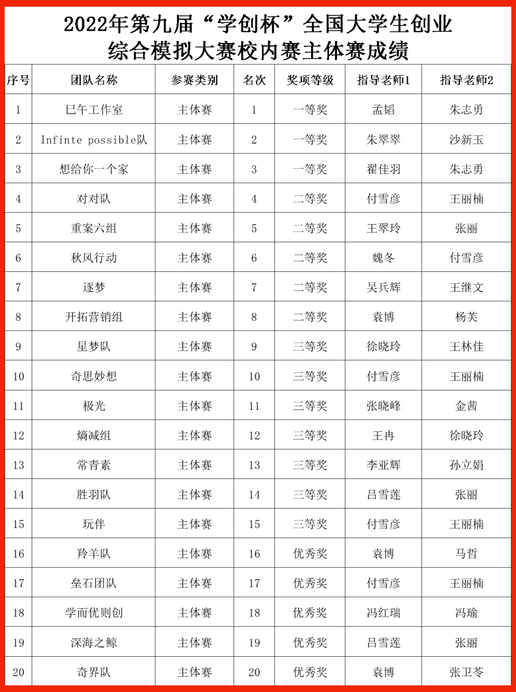 此次校内选拔赛吸引了来自传媒艺术系、经济贸易系、会计系、管理系、软件工程系、计算机应用系的43支队伍参赛,参赛人数为129人。经过四个多小时的激烈角逐,最终传媒艺术系的“巳午工作室”“Infinte possible队”“想给你一个家”获得主体赛一等奖;传媒艺术系的“必胜队”“斗地组”“筑梦队”获得创业营销专项赛一等奖。以上一等奖获奖团队将推荐参加省级选拔赛。另外,两条赛道各有5个团队获得二等奖、7个团队获得三等奖。同时,获得一等奖的团队指导教师荣获“最佳指导教师”称号,获得二、三等奖的团队指导教师荣获“优秀指导教师”称号。