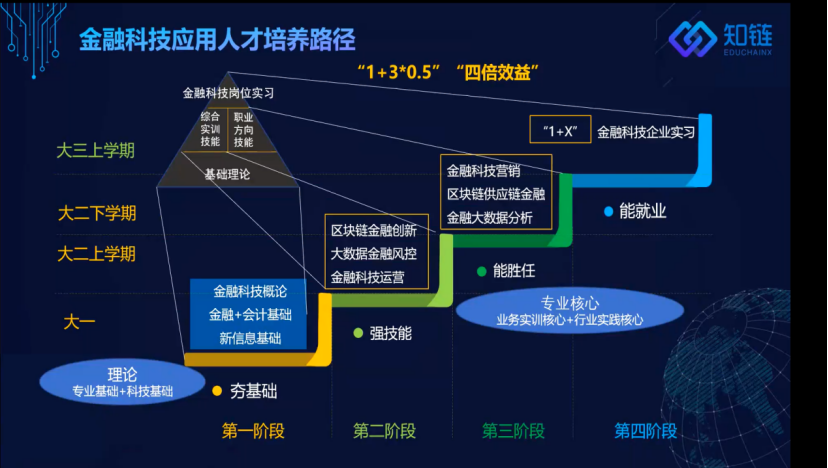 北京知链科技有限公司方案总监周博老师进行了题为《金融科技发展趋势与专业人才培养模式分享》的主题分享。他指出金融科技人才培养需要顺应企业用人的真实需求,需要符合人才培养的教学规律,加强金融专业与科技结合的复合型人才培养成为全国各大院校在专业发展过程的创新点,与时俱进推动专业发展成为金融科技应用专业老师的新课题。