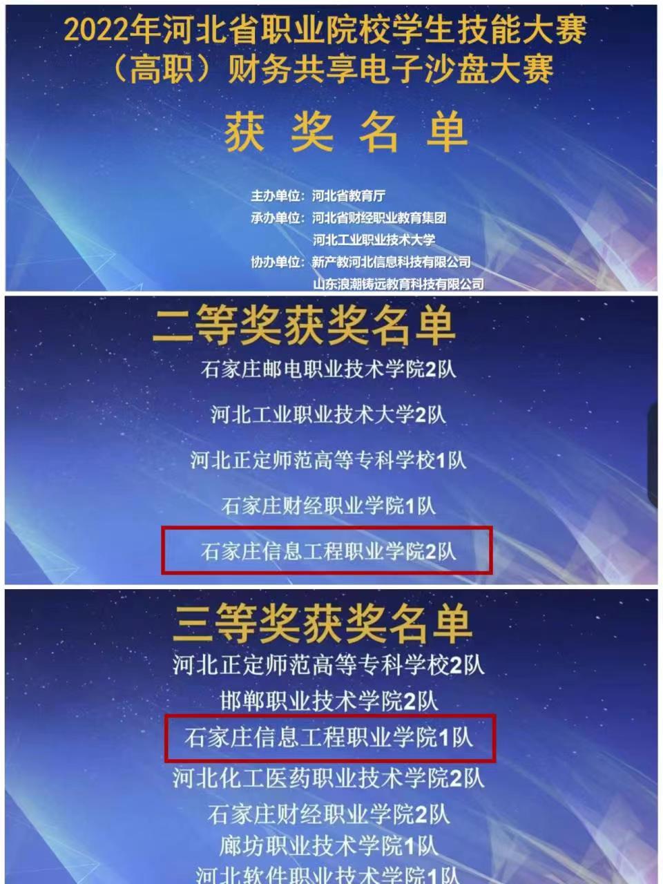 由河北省教育厅主办、河北省财经职业教育集团承办的2022年河北省职业院校学生技能大赛(高职)财务共享电子沙盘大赛以线上竞赛的方式举行。我院会计系大数据与会计专业刘子薇、何一凡、赵运晟、路森淆4名同学组成的石家庄信息工程职业星空(中国)2队荣获二等奖,武晓铮、王春悦、王紫依、张爱月4名同学组成的石家庄信息工程职业星空(中国)1队荣获三等奖。