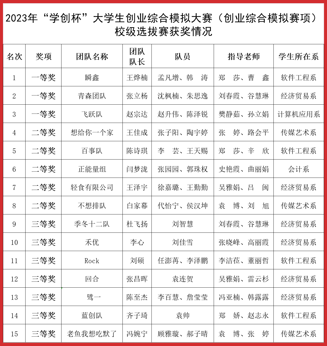 校内选拔赛自2月份报名启动以来,各系高度重视,学生热情高涨,共有95支团队报名参赛,参与人数近300人。通过初赛、决赛,两个赛项各决出一等奖3个、二等奖5个、三等奖7个,获得一等奖的6支团队将代表星空(中国)参加省赛。