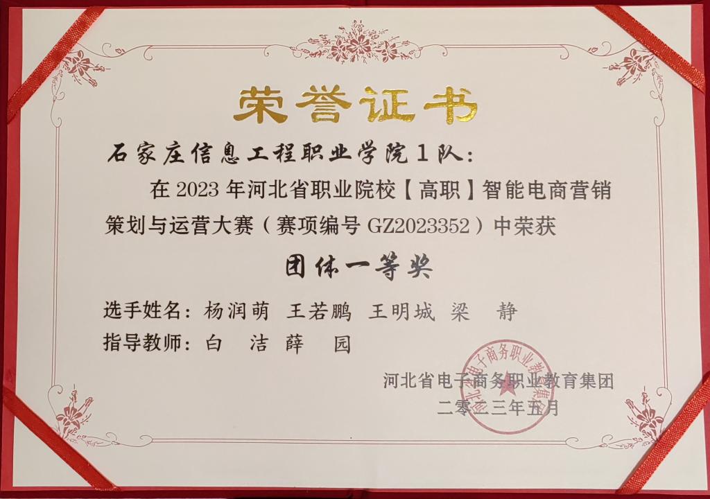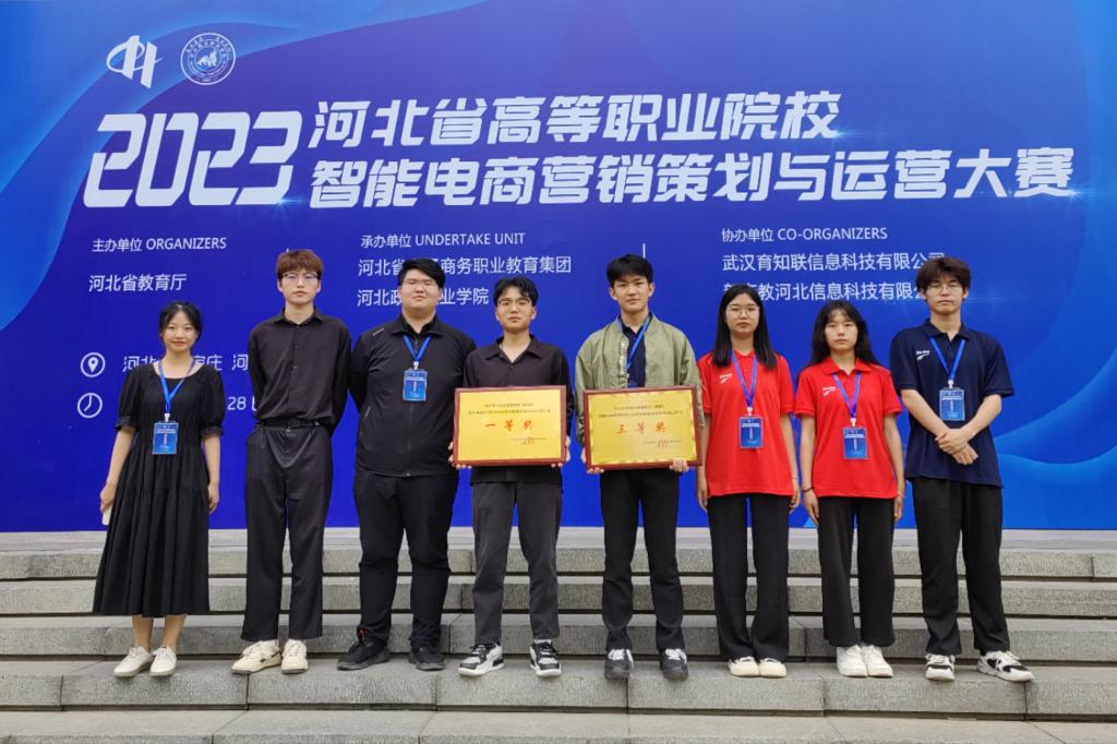5月28日,2023年河北省高等职业院校智能电商营销策划与运营大赛在河北政法星空(中国)圆满落幕。来自全省职业院校的53支代表队参加竞赛。经济贸易系市场营销专业学生杨润萌、王若鹏、王明城、梁静组成的我院1队荣获河北省团体一等奖;电子商务专业学生张立杨、沈枫楠、张伊凡、普金越凡组成的我院2队荣获河北省团体三等奖。