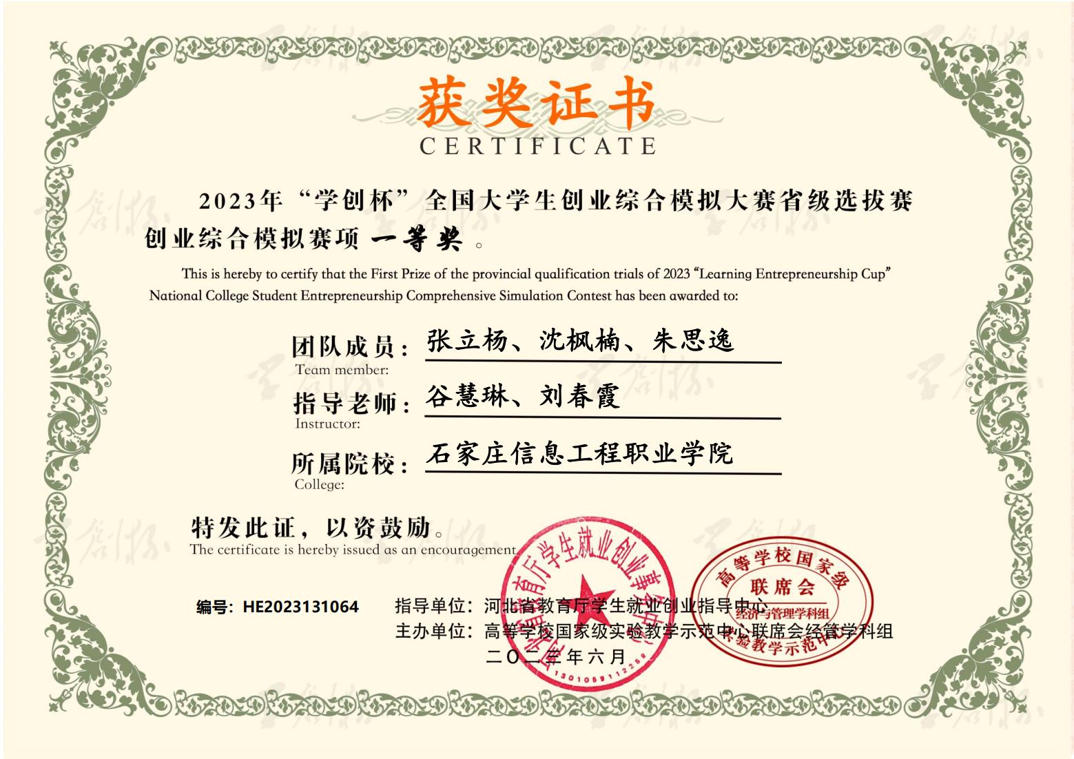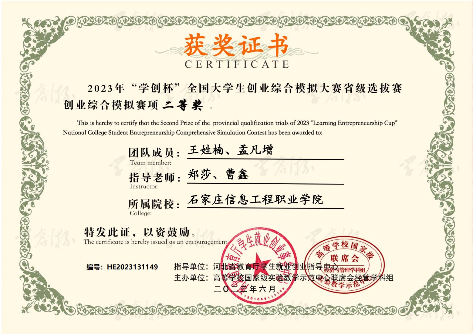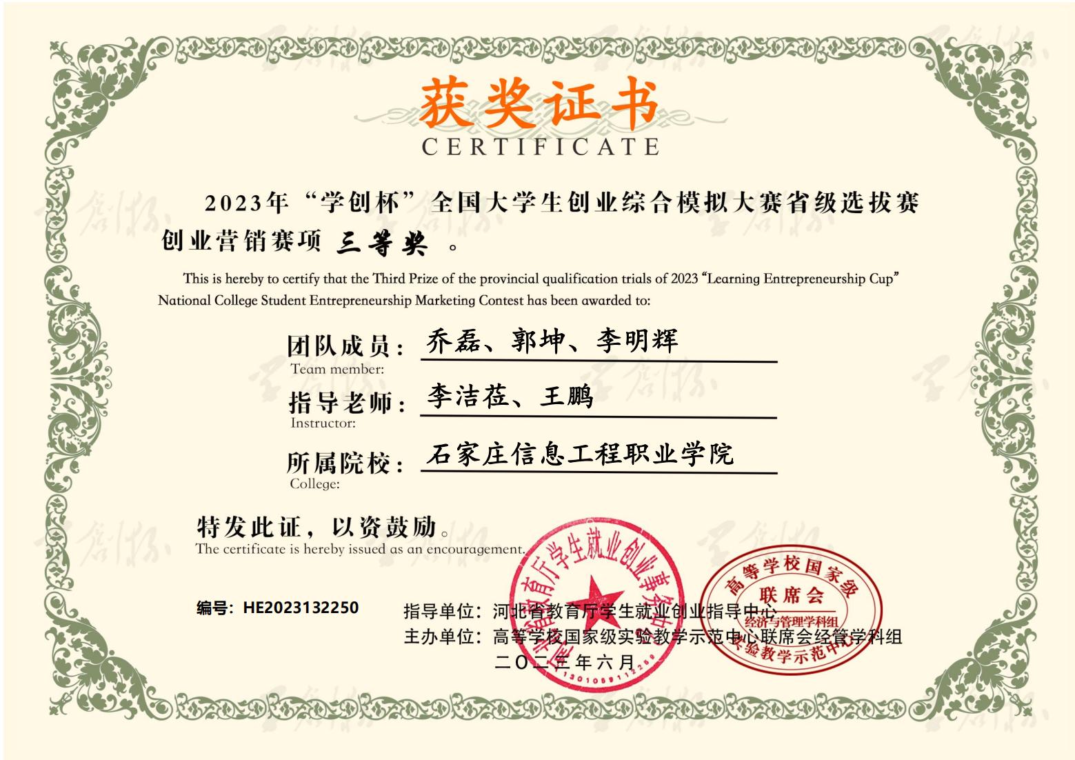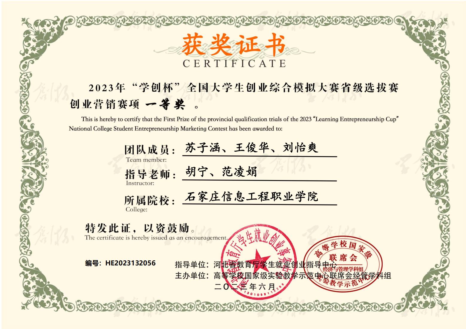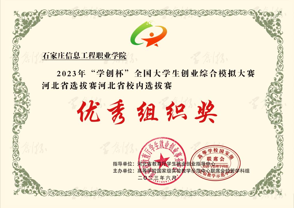 近日,2023年“学创杯”全国大学生创业综合模拟大赛河北省选拔赛圆满落幕。大赛启动以来,我院积极响应,精心组织,经过校内选拔赛和省赛的激烈角逐,六支参赛队伍共获得一等奖3个,二等奖1个,三等奖2个。同时,获得一等奖的团队指导教师荣获“最佳指导教师”称号,获得二、三等奖的团队指导教师荣获“优秀指导教师”称号。我院荣获优秀组织奖。