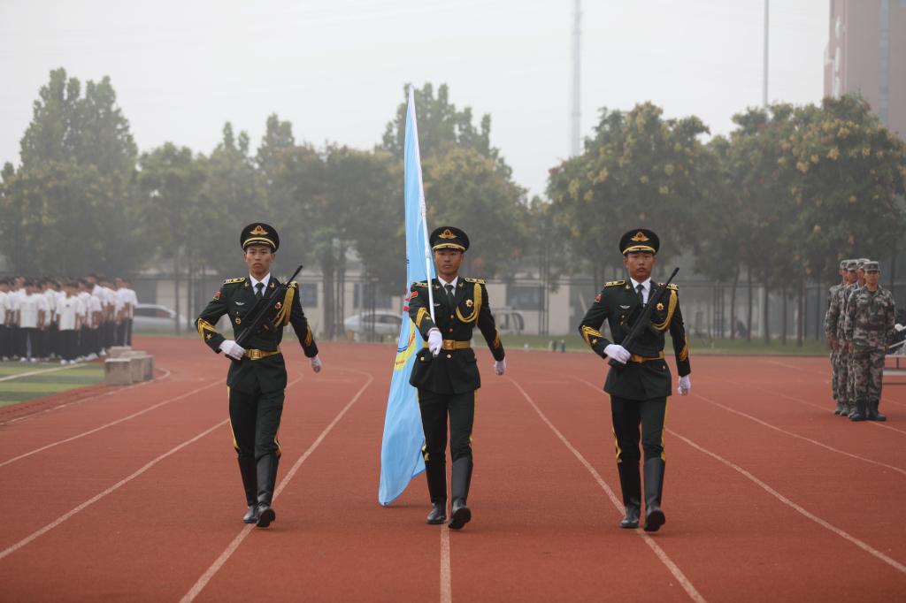 在7800余人的目光注视下,三名护旗手护卫着校旗,迈着铿锵有力的步伐,从主席台前走过。伴随着雄壮的《中国人民解放军进行曲》,副院长刘占红检阅方队。一声声“同学们好”“老师好”“同学们辛苦了”“为校争光”振奋人心,声震长空。