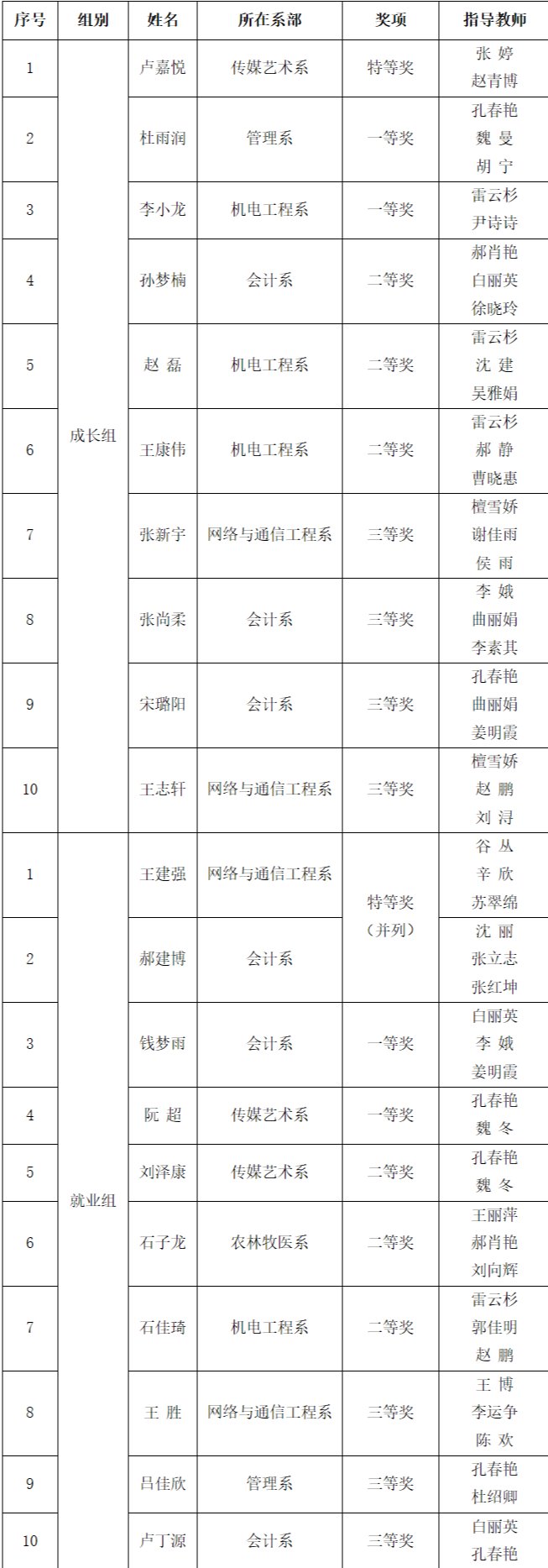 经过激烈角逐,成长赛道卢嘉悦获得特等奖,杜雨润、李小龙获得一等奖,孙梦楠、赵磊、王康伟获得二等奖,张新宇、张尚柔、宋璐阳、王志轩获得三等奖;就业赛道王建强、郝建博获得特等奖,钱梦雨、阮超获得一等奖,刘泽康、石子龙、石佳琦获得二等奖,王胜、吕佳欣、卢丁源获得三等奖。