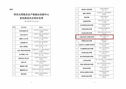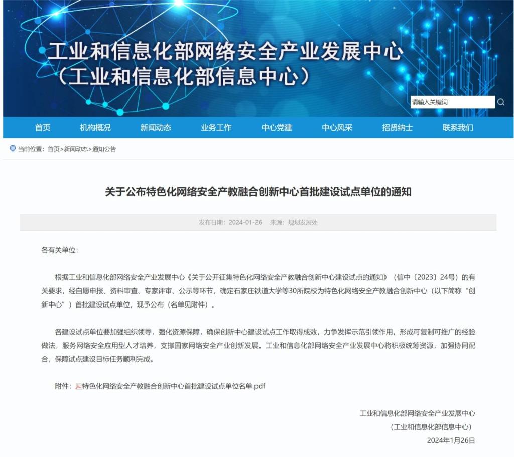 近日,工业和信息化部公布了特色化网络安全产教融合创新中心首批建设试点单位,我院成功入选。此次申报历时半年,经过政产学各界专家初审、实地考察、汇报答辩、专家终审等多轮竞争,最终从179所本科、高职院校中评选出30所入围特色化网络安全产教融合创新中心首批建设试点单位。