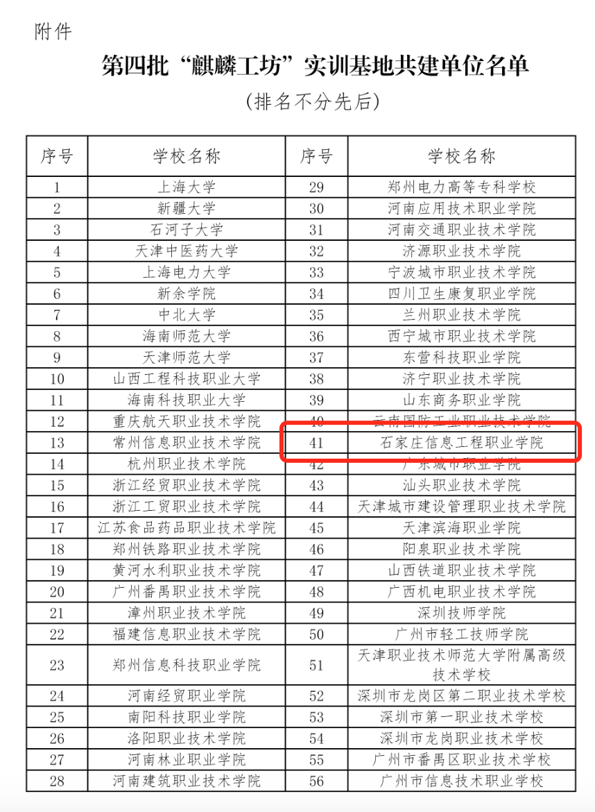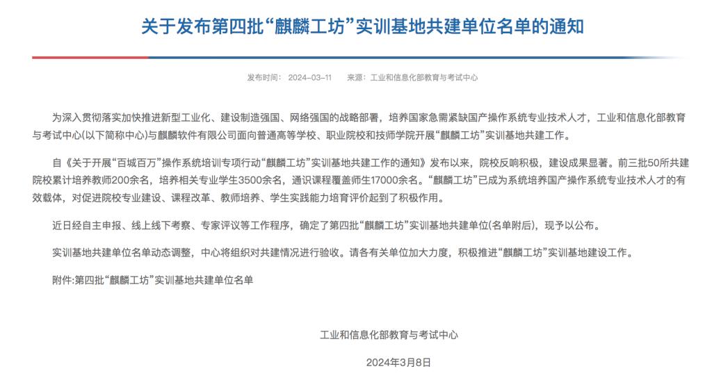 近日,工业和信息化部教育与考试中心公布了第四批“麒麟工坊”实训基地共建单位名单,我院成功入选。“麒麟工坊”是教考中心与麒麟软件联合推出的“百城百万”操作系统培训专项行动中重点开展的实践基地共建项目,面向普通高等学校、高等职业学校征集共建示范性实训基地。