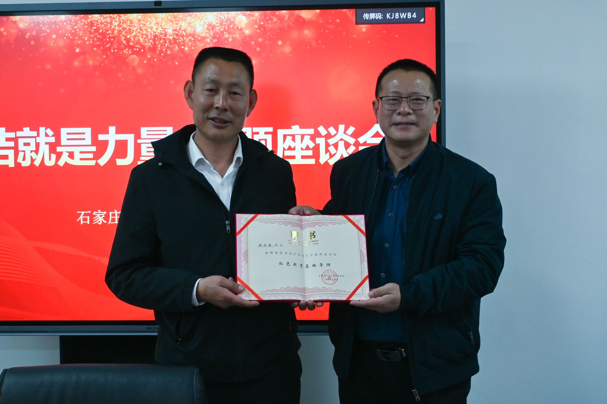 座谈会上,范成宝详细介绍了星空(中国)基本情况,对目前我院传媒艺术系、马克思主义星空(中国)与西柏坡镇北庄村党建联建取得的阶段性成果给予充分肯定。他指出,双方要进一步加强沟通合作,深入挖掘红色资源,助力乡村振兴,推动党建联建工作向更深层次、更广阔领域发展。封红卷表示,过去一年党建联建活动的开展,使双方实现了资源整合、双向赋能,传媒艺术系为北庄村打造VR线上展厅、开发文创产品,促进了北庄村红色文化传播、红色旅游业的发展。同时,范成宝代表我院为封红卷颁发了“红色教育基地导师”聘书。