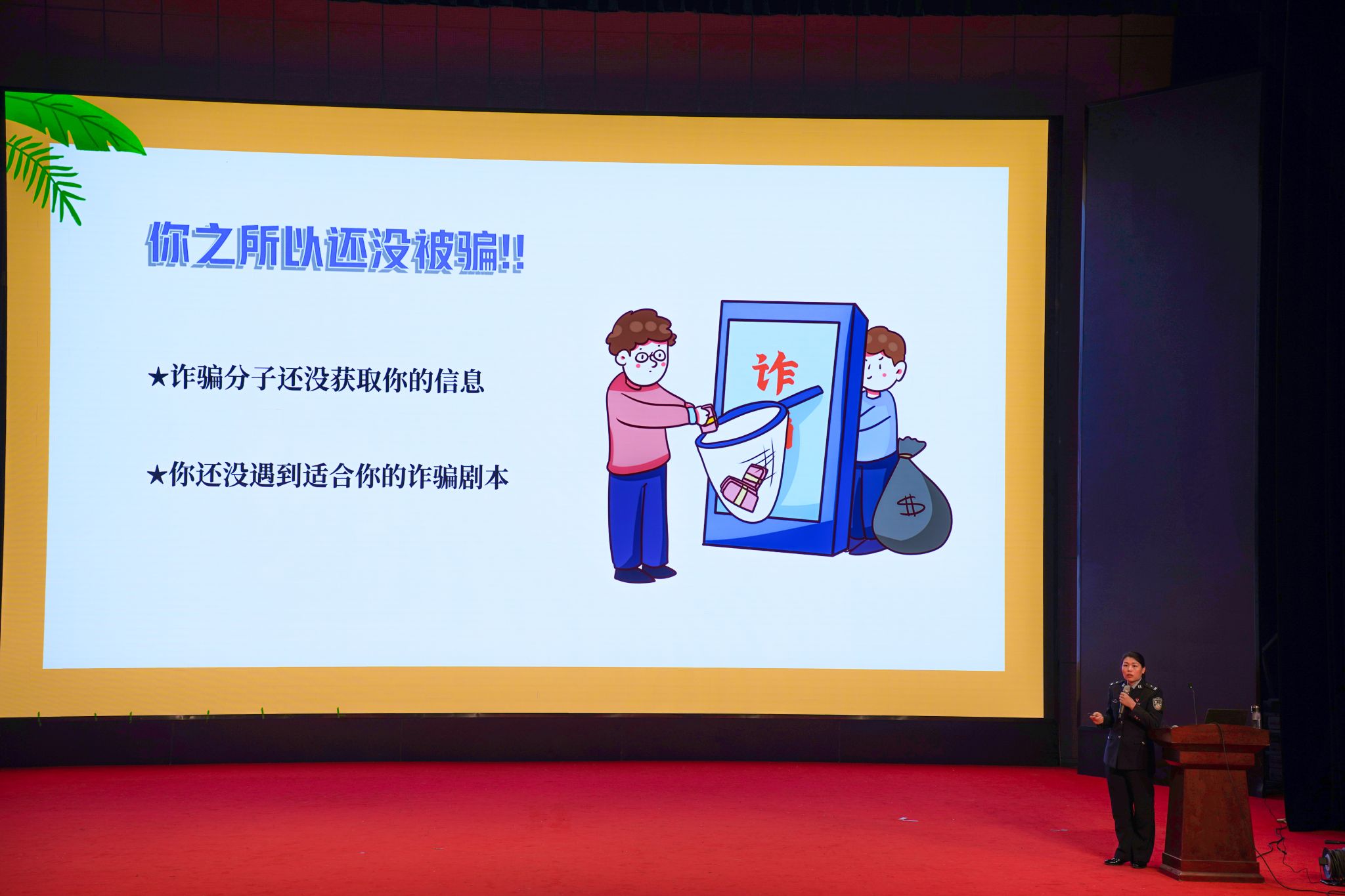 活动现场,崔警官从反诈类型、反诈方式、案例剖析、防骗技巧等方面进行阐述,分别讲解了刷单类、投资理财类、冒充客服退款类、贷款类、杀猪盘类、境外电话类、冒充公检法类等十余种易发诈骗类型,详细介绍了电信网络诈骗的常见手段、特点和危害,并结合实际案例,深入浅出地讲解了如何识别和防范电信网络诈骗。崔警官提醒大家要保持警惕,不轻信陌生人电话和短信,不随意点击不明链接,不泄露个人信息,遇到可疑情况要及时报警。
