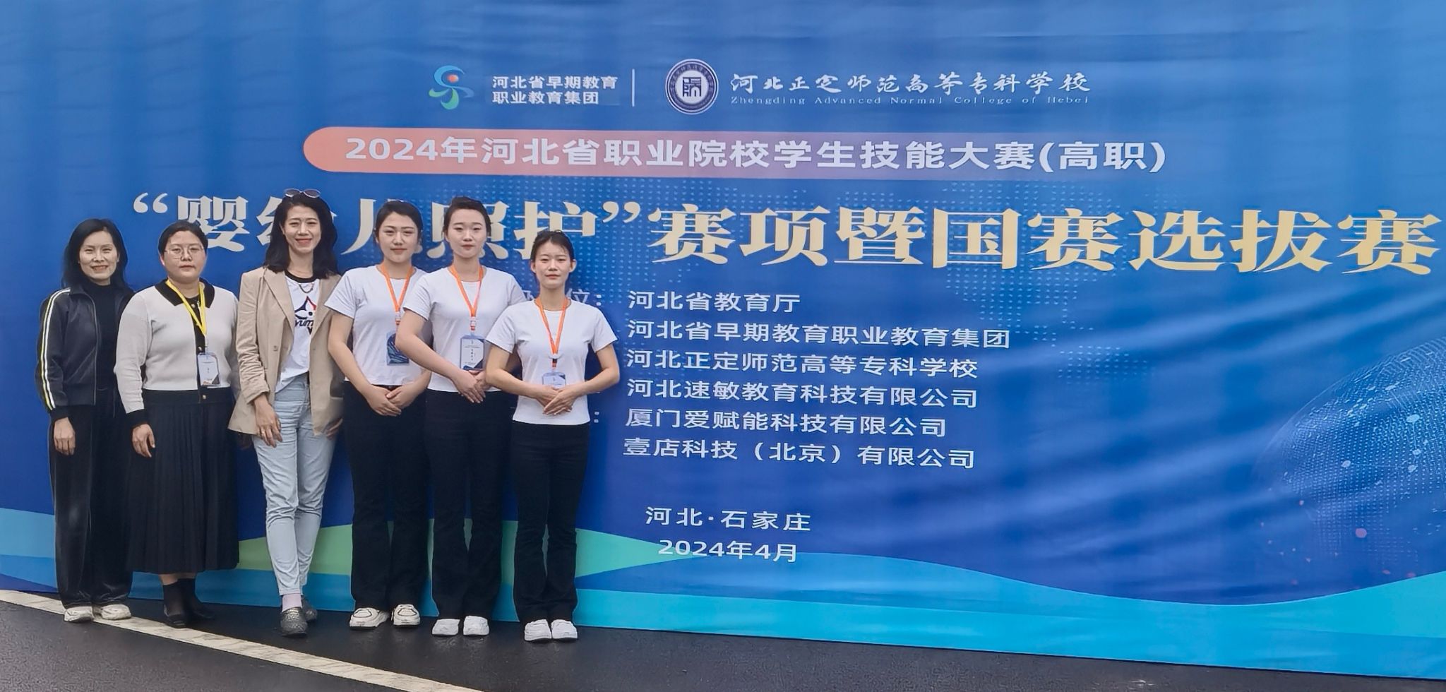 4月13日—14日,2024年河北省职业院校学生技能大赛(高职)“婴幼儿照护”赛项暨国赛选拔赛、2024年河北省职业院校技能大赛婴幼儿照护教师赛在河北正定师范高等专科学校举行,我校婴幼儿托育服务与管理专业学生李建美、窦英硕、马纪评在刘旭、周格两位老师的指导下,荣获团体一等奖;教师蔡亚欣、王乐、杨松涛荣获教师组团体二等奖。