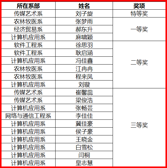 比赛共设置特等奖1名,一等奖3名,二等奖6名,三等奖10名,获奖名单如下: