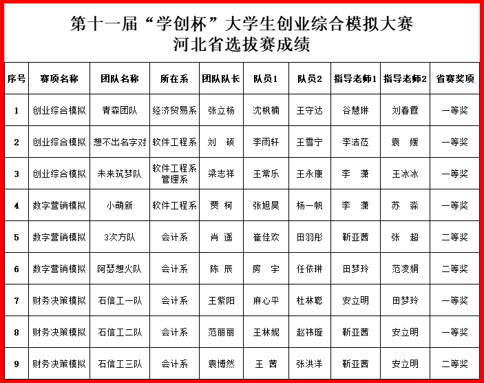 5月25日—26日,第十一届“学创杯”全国大学生创业综合模拟大赛河北省选拔赛圆满落幕。此次比赛分为创业综合模拟、数字营销模拟、财务决策模拟三个赛项,共计831支团队参赛,我院九支参赛队伍共获得一等奖6个,二等奖3个。同时,获得一等奖的团队指导教师荣获“最佳指导教师”称号,获得二等奖的团队指导教师荣获“优秀指导教师”称号。