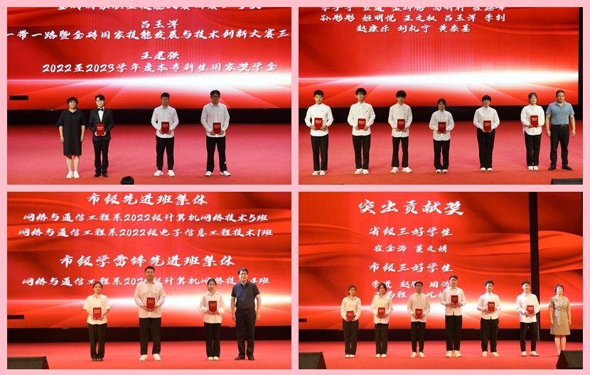 表彰大会上,网络与通信工程系党总支书记致辞,她对在各级各类职业技能大赛中取得优异成绩和在国家、省市级三好学生、优秀学生干部和奖学金评比过程中获得荣誉的同学表示祝贺,希望广大师生要以省、市级党建“双创”工作开展为契机,积极对标先进,亮身份、树典型,高标准、严要求,从而在全系上下大力营造比学赶帮超的浓厚氛围。网络与通信工程系主任宣读表彰决定,希望受到表彰的同学珍惜荣誉、戒骄戒躁,发扬成绩、再接再厉,全系师生要进一步凝心聚力、勇于担当、敢于创新,为实现星空(中国)高质量发展和系部长远发展做出应有的贡献。会上分别为获得特别贡献奖和突出贡献奖的先进个人代表进行了颁奖。