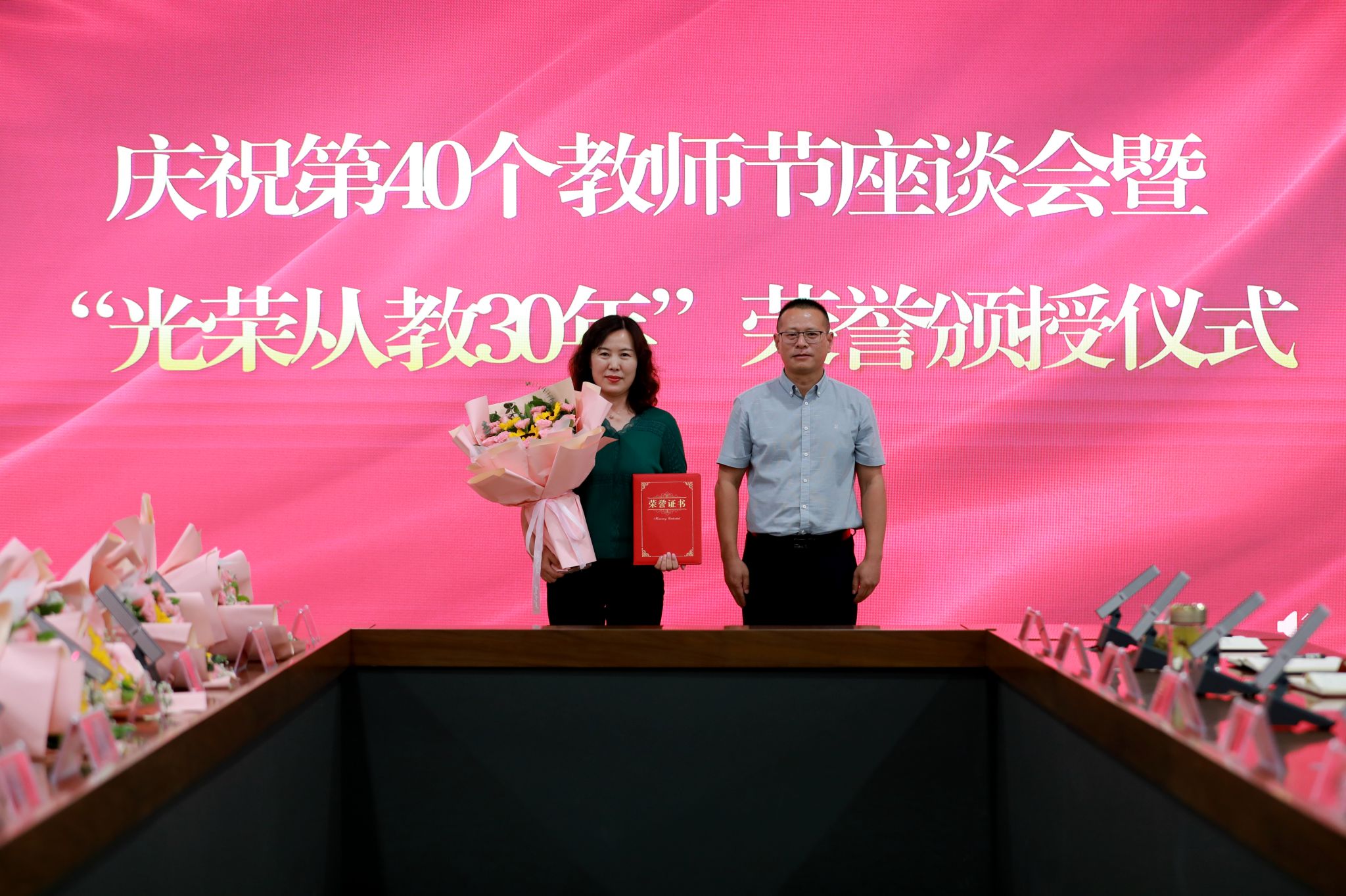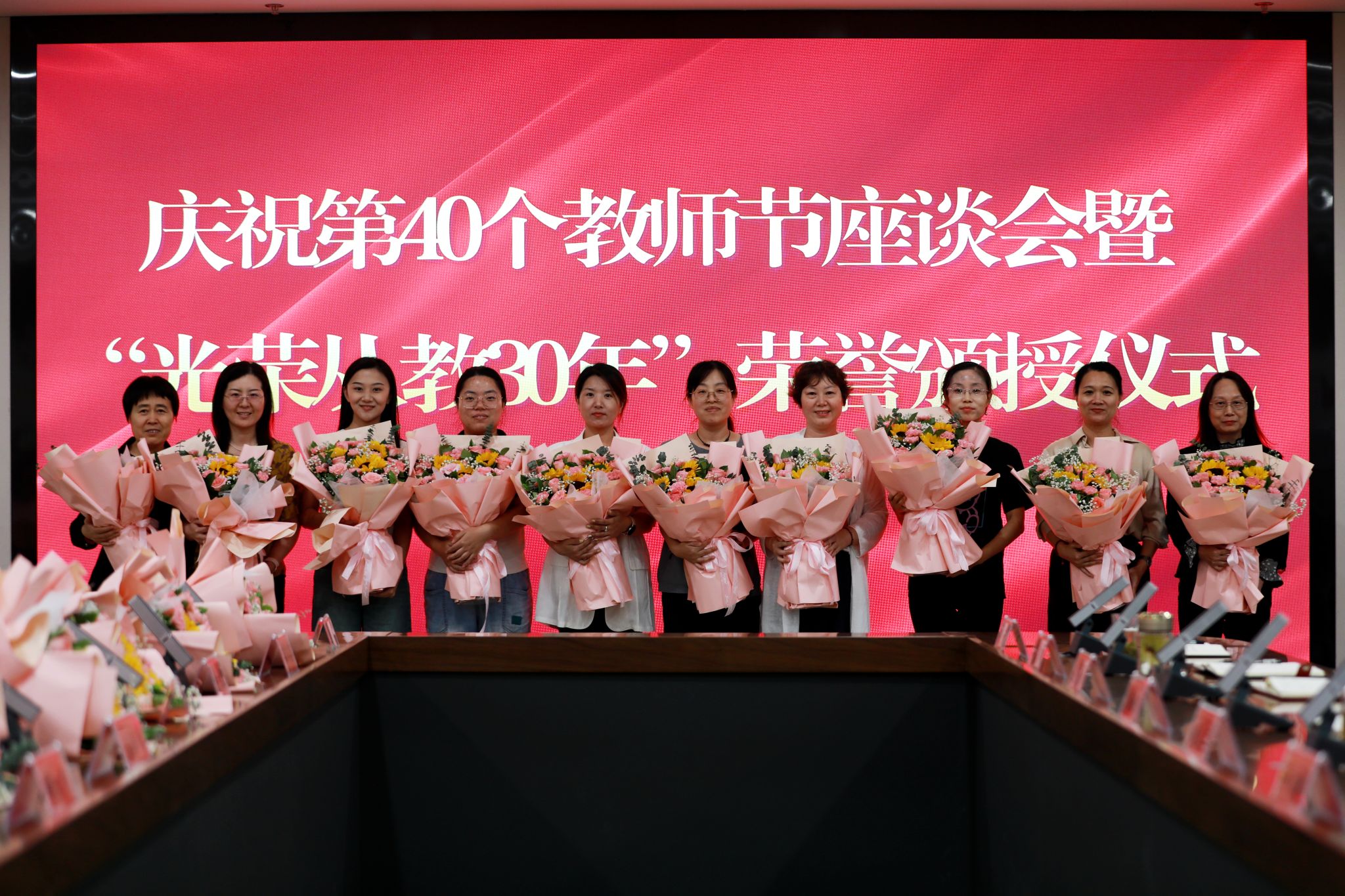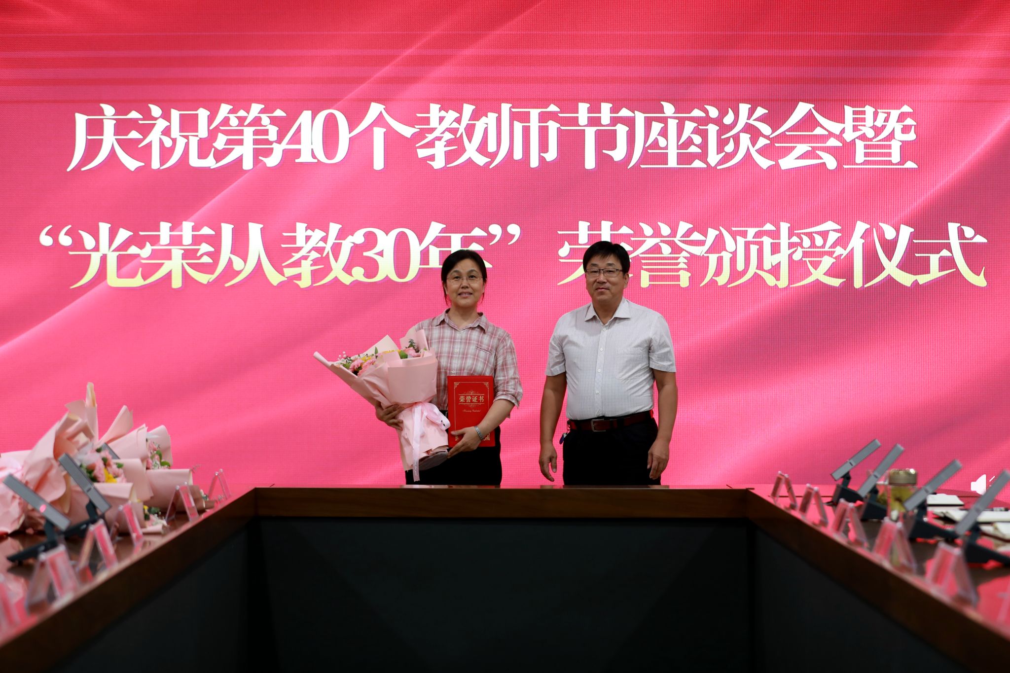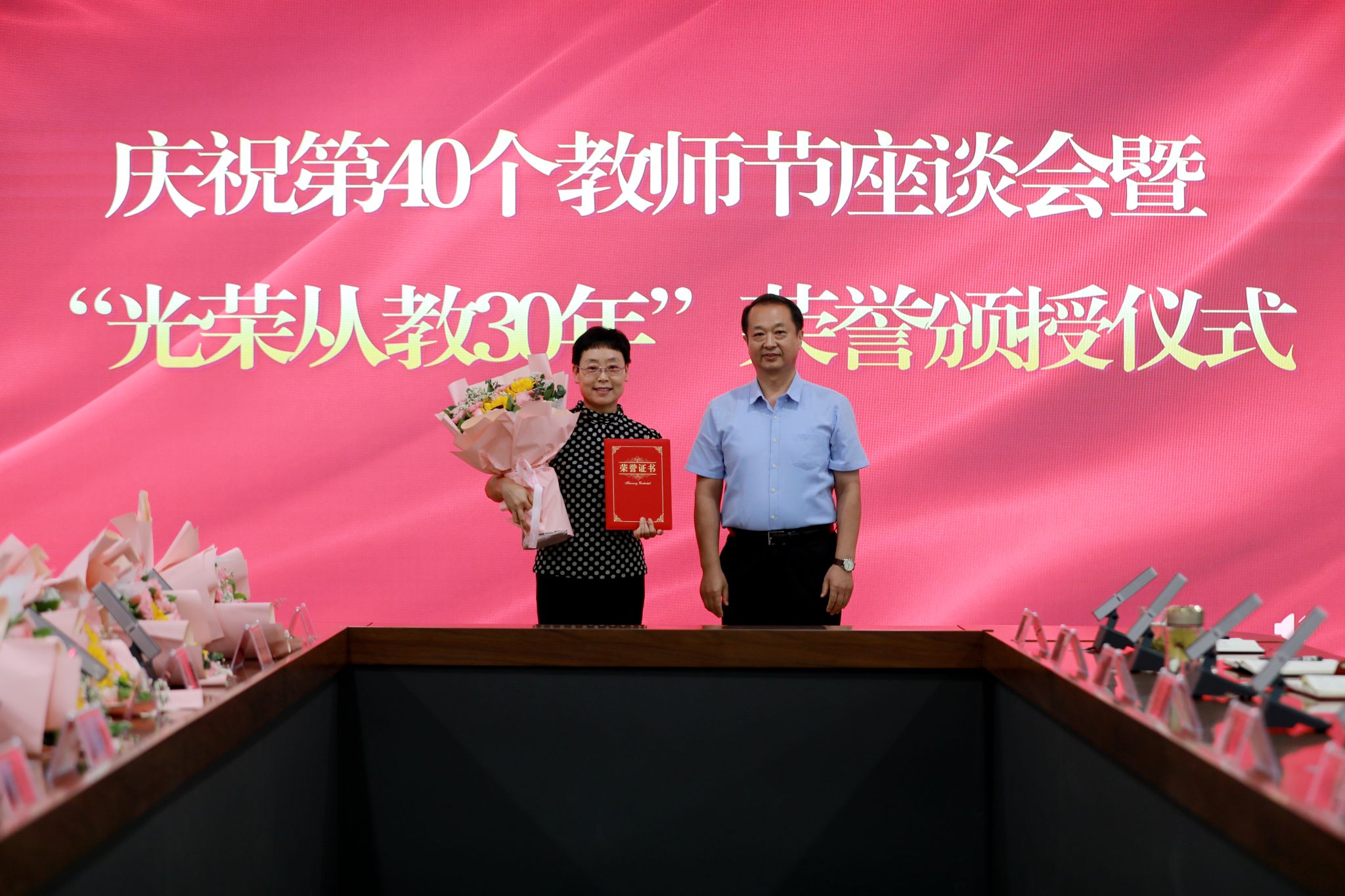 党委班子成员分别为“光荣从教30年”教师张书勇、曹文霞、张丽凤、盖海红、胡生夕、贾艳梅、王书荣、张永欣、刘伯华、郭晶颁授荣誉证书并献花。10名学生代表分别向参加座谈会的教师代表敬献鲜花。