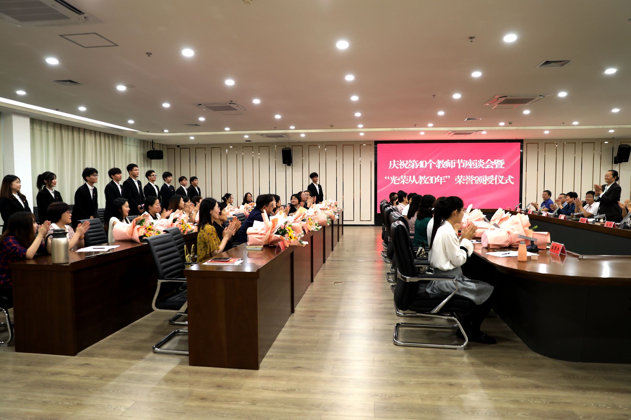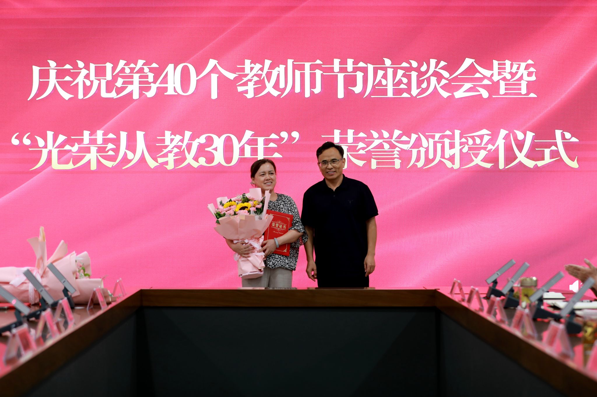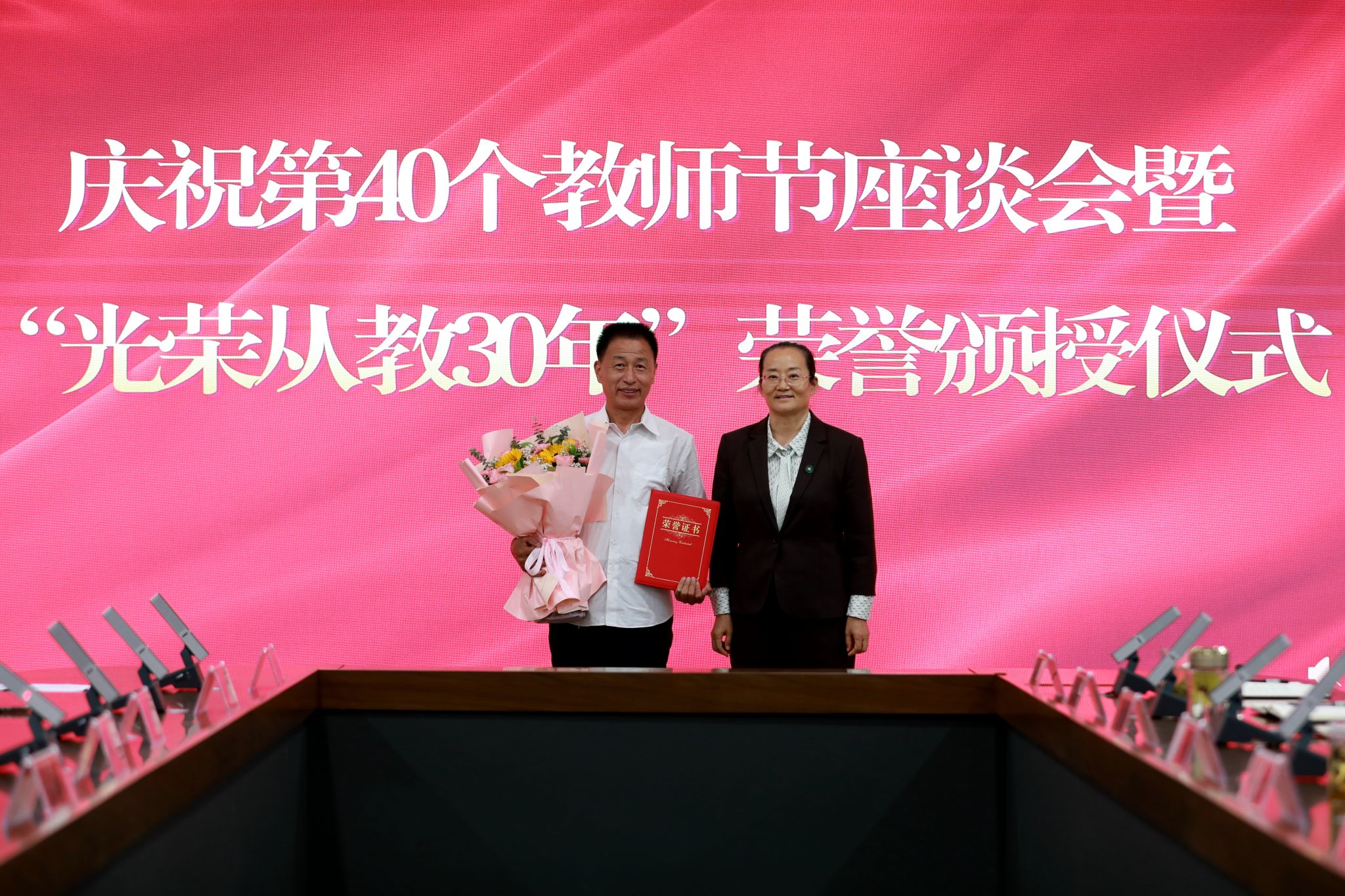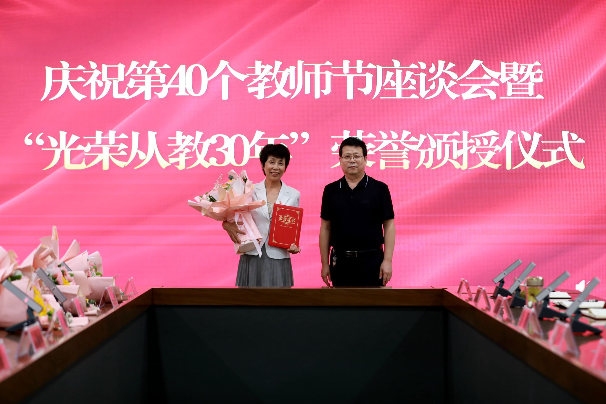 党委班子成员分别为“光荣从教30年”教师张书勇、曹文霞、张丽凤、盖海红、胡生夕、贾艳梅、王书荣、张永欣、刘伯华、郭晶颁授荣誉证书并献花。10名学生代表分别向参加座谈会的教师代表敬献鲜花。