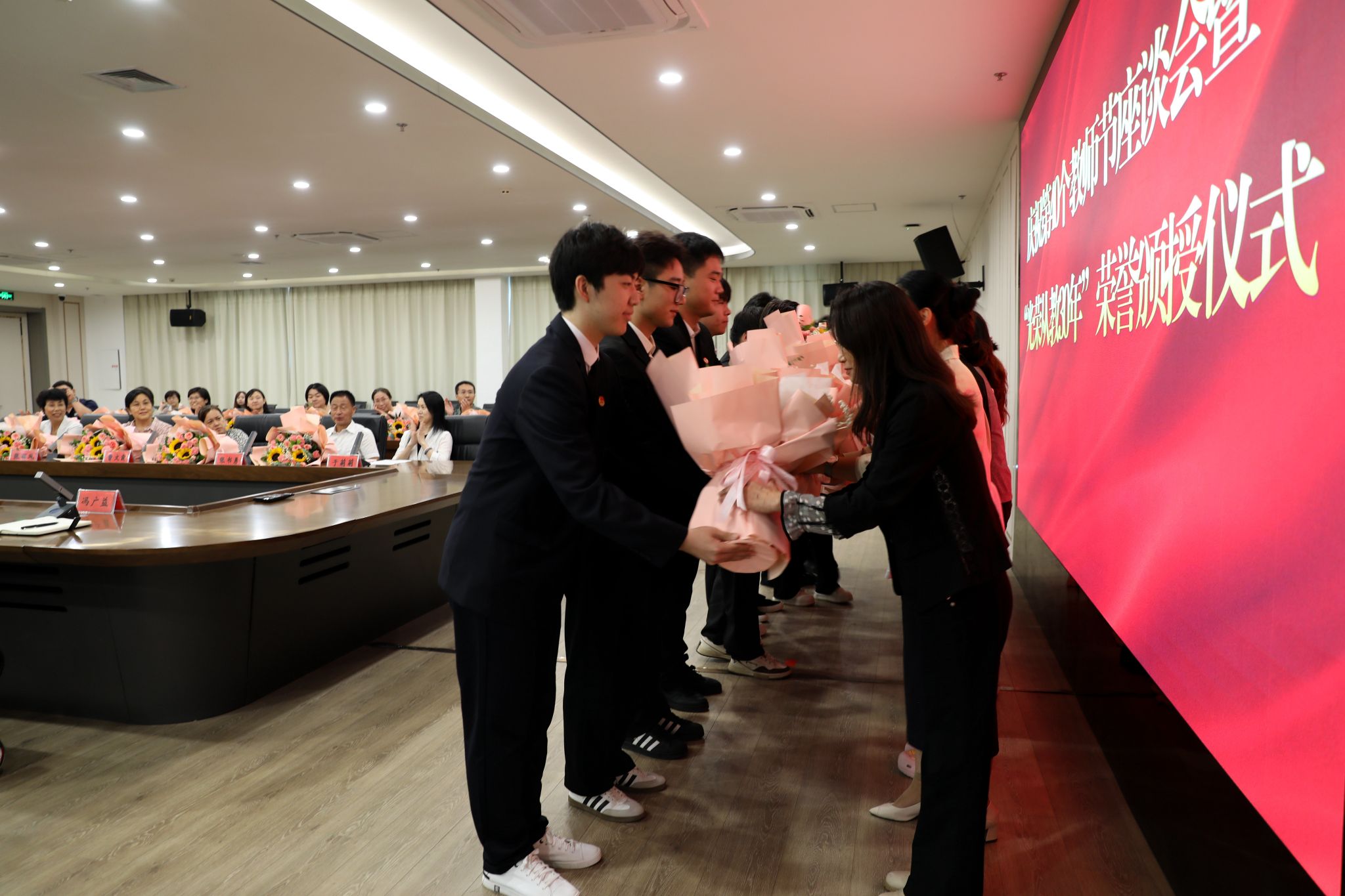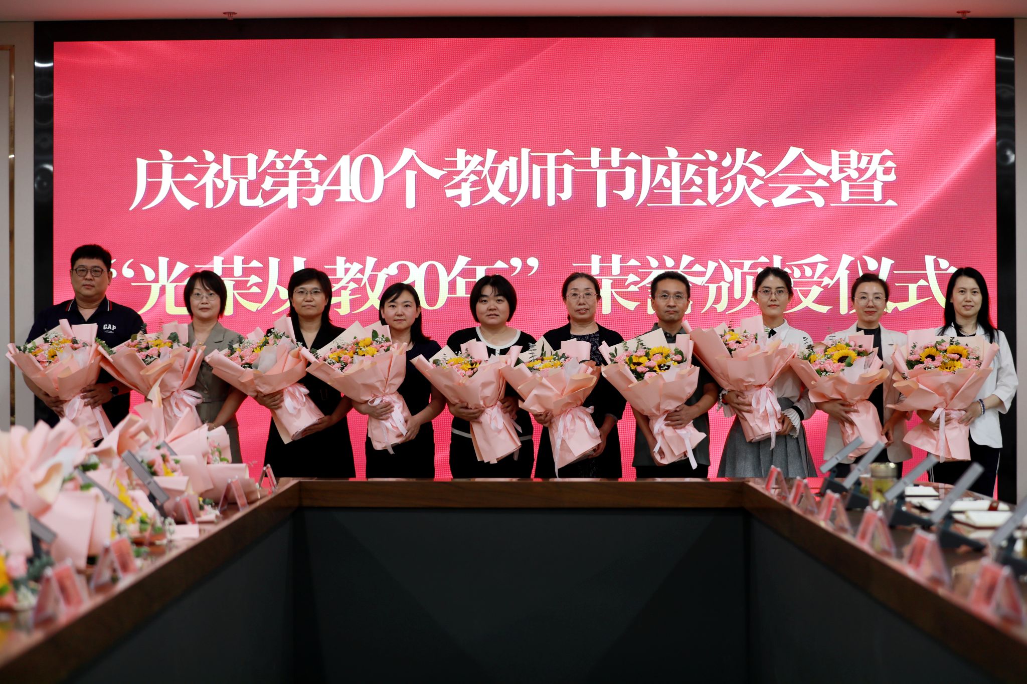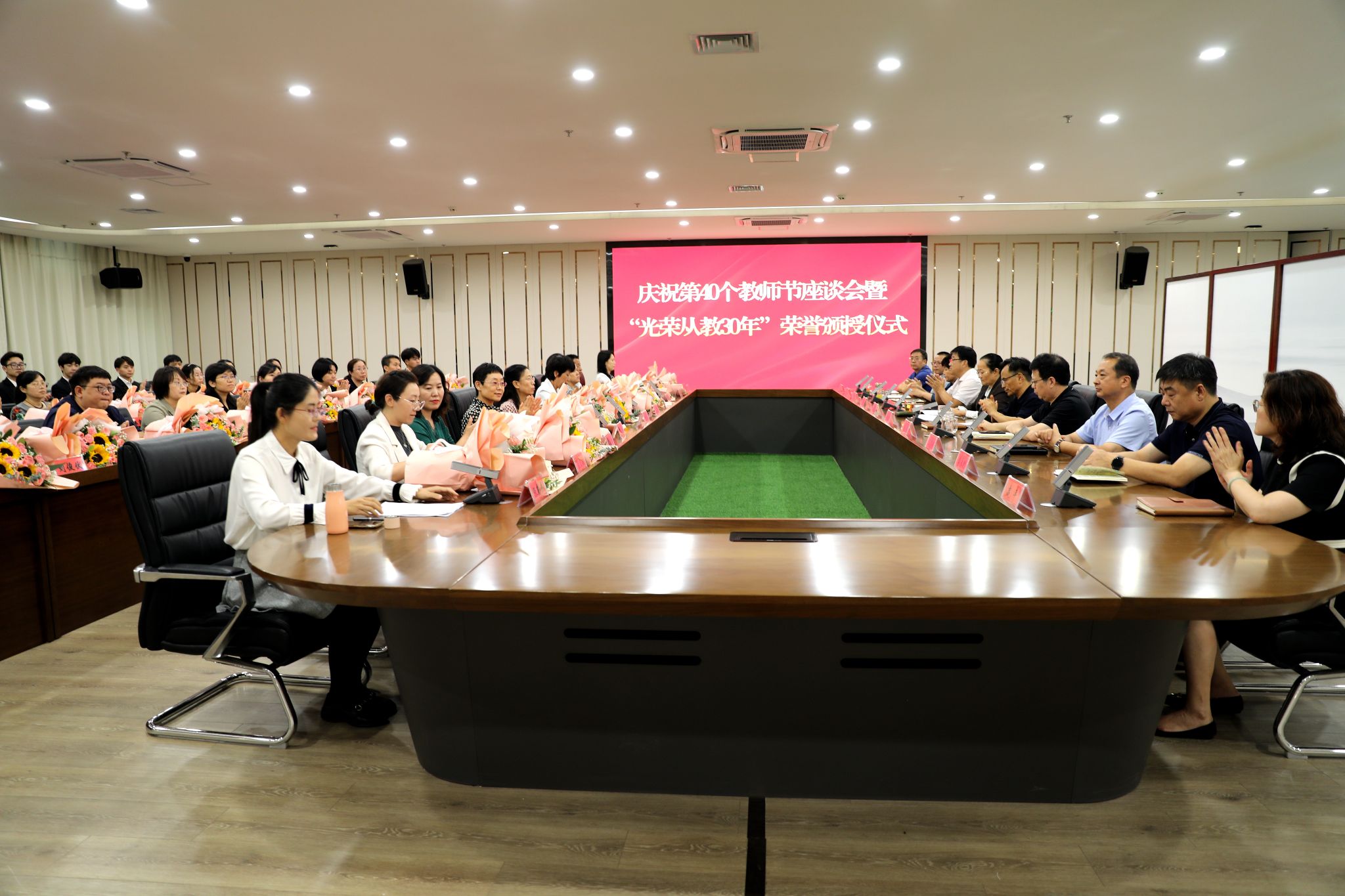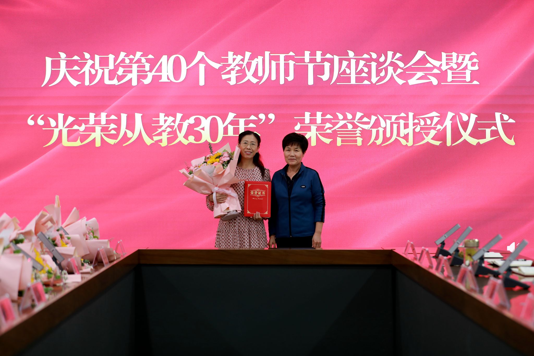 党委班子成员分别为“光荣从教30年”教师张书勇、曹文霞、张丽凤、盖海红、胡生夕、贾艳梅、王书荣、张永欣、刘伯华、郭晶颁授荣誉证书并献花。10名学生代表分别向参加座谈会的教师代表敬献鲜花。