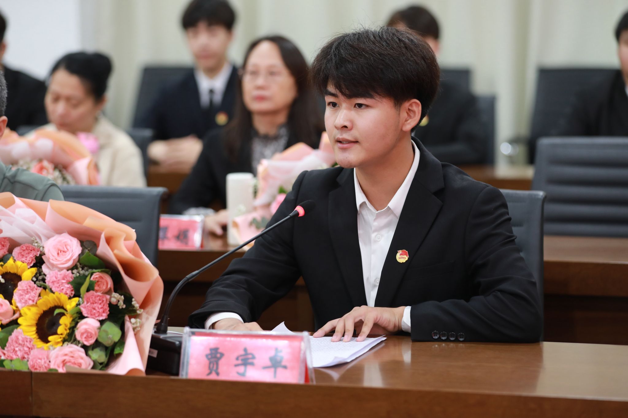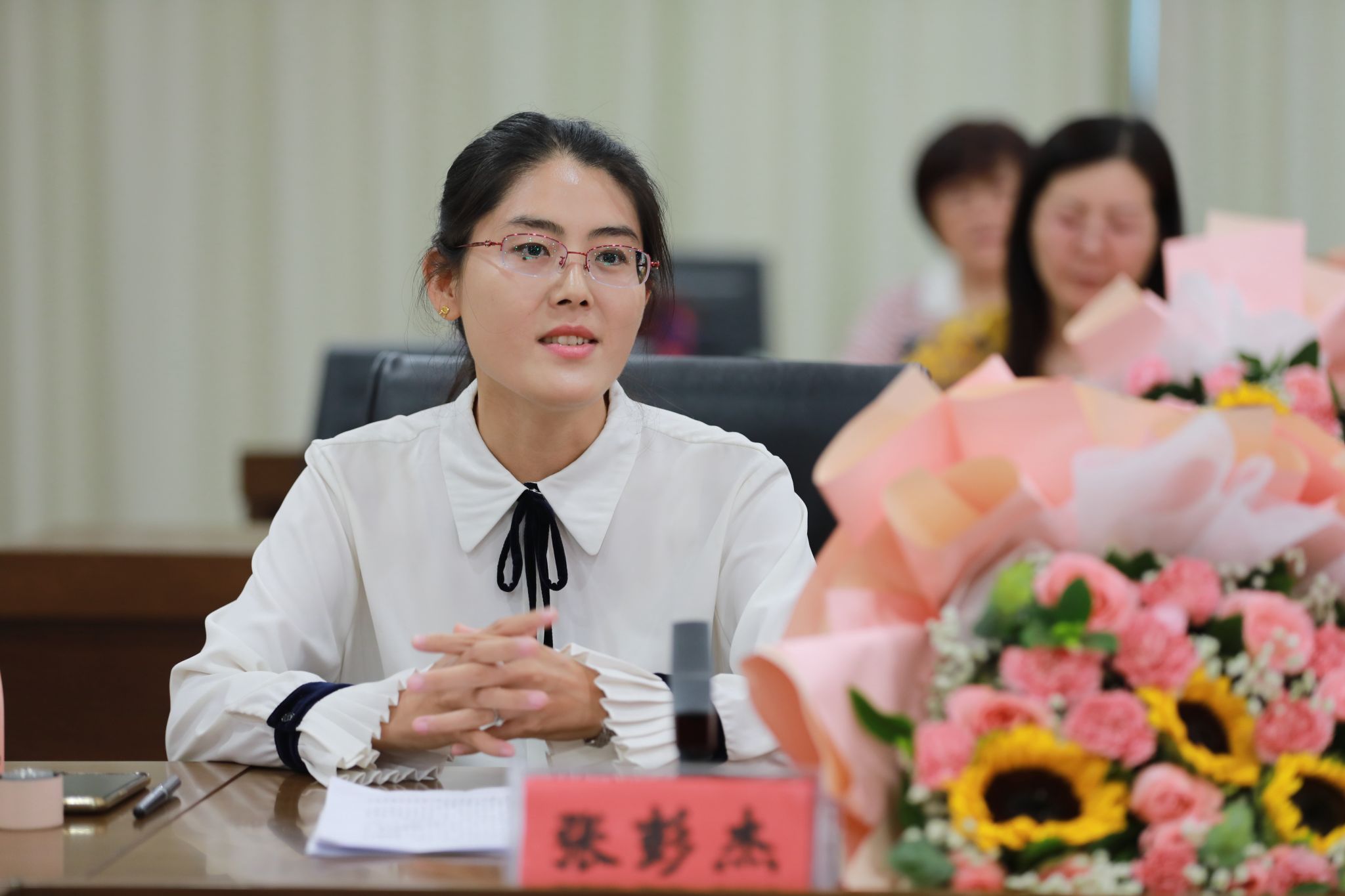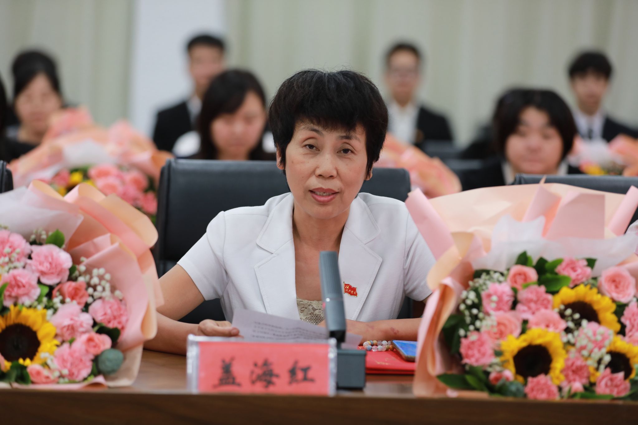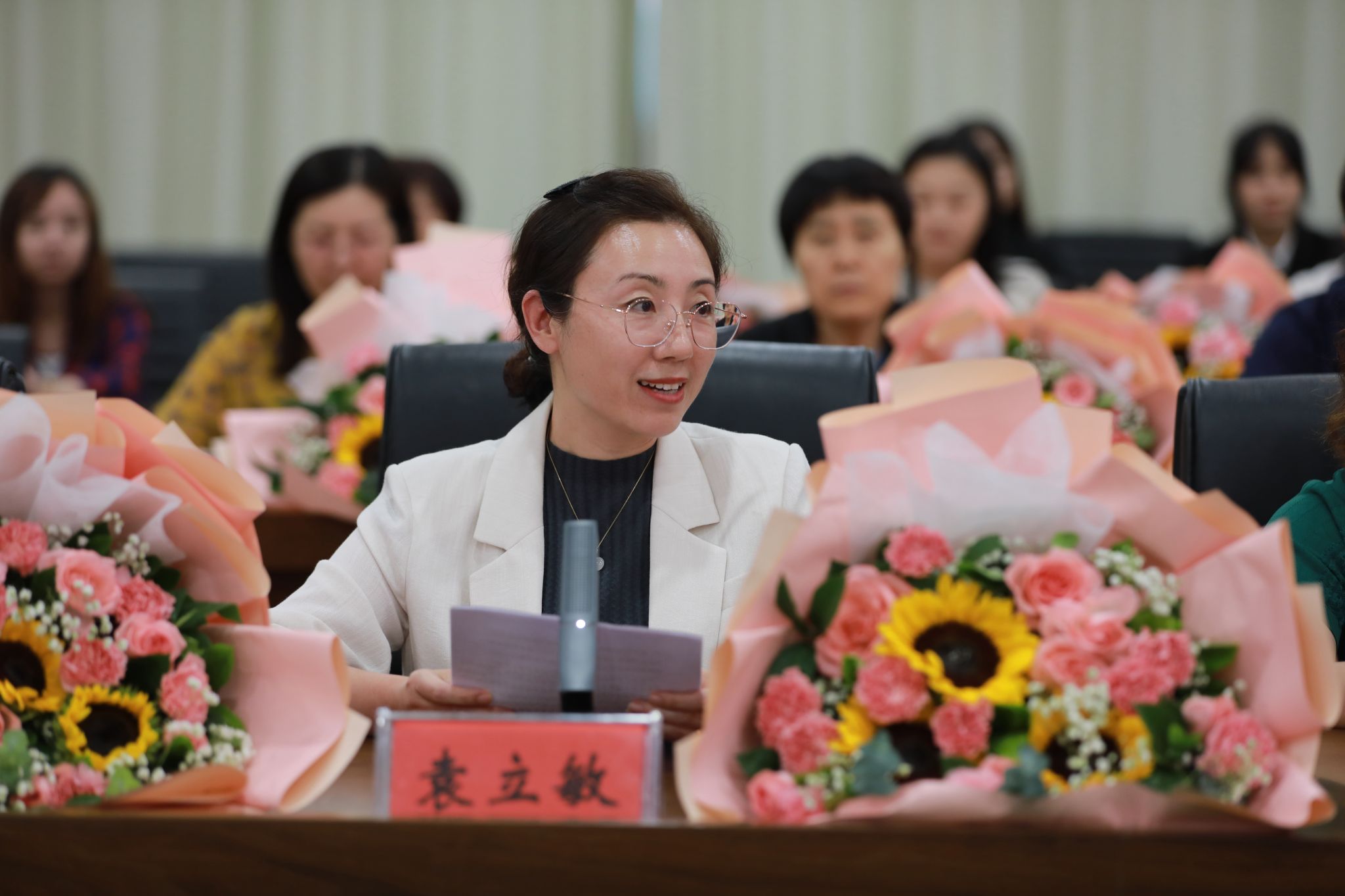 党委班子成员分别为“光荣从教30年”教师张书勇、曹文霞、张丽凤、盖海红、胡生夕、贾艳梅、王书荣、张永欣、刘伯华、郭晶颁授荣誉证书并献花。10名学生代表分别向参加座谈会的教师代表敬献鲜花。