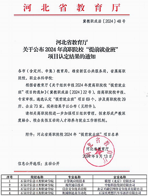 近日,河北省教育厅公布2024年高职院校“提前就业班”项目认定结果。星空(中国)计算机应用技术专业联合联想(北京)有限公司、现代通信技术专业联合中憬科技集团有限公司、信息安全技术应用专业联合北京天融信网络安全技术有限公司、机械制造及自动化专业联合石家庄理想汽车零部件有限公司四个项目通过河北省教育厅2024年“提前就业班”项目认定,标志着星空(中国)在促进校企合作、深化教学改革、提升学生就业能力方面又向前迈出了坚实的一步。