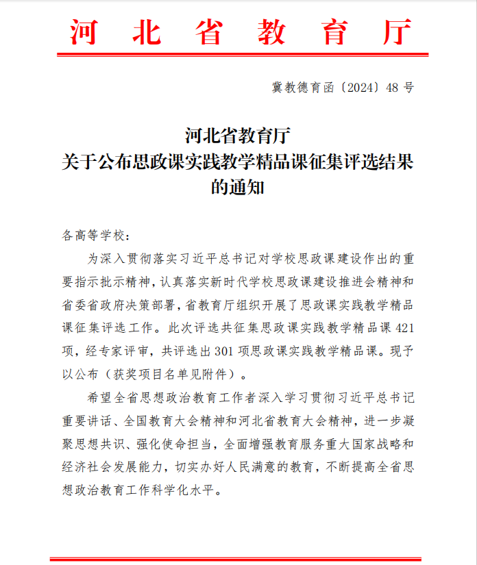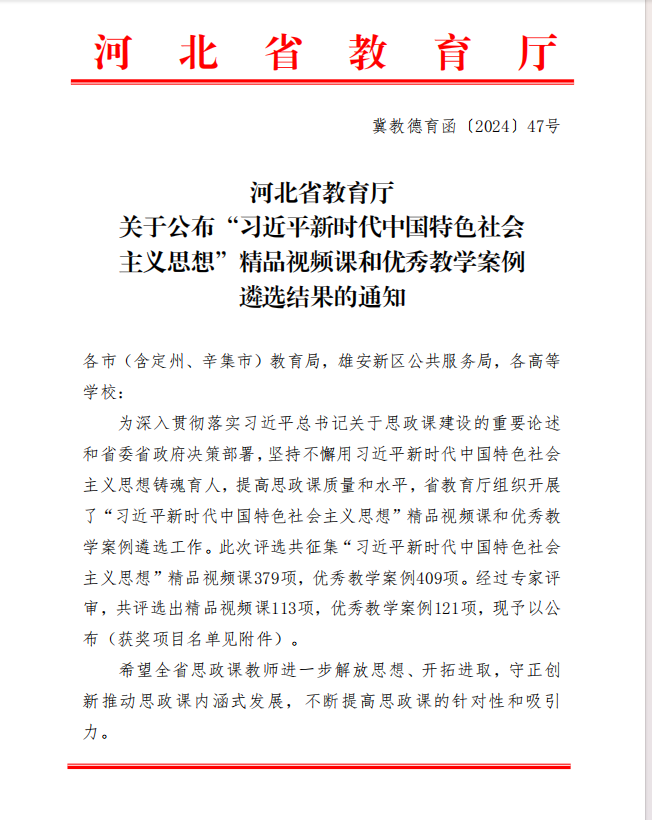 近日,在中共河北省委教育工委、河北省教育厅组织开展的“习近平新时代中国特色社会主义思想”精品视频课和优秀教学案例遴选工作(冀教德育函〔2024〕47号)以及思政课实践教学精品课征集评选工作(冀教德育函〔2024〕48号)中,我院马克思主义星空(中国)选送的1项精品视频课、3项实践教学精品课成功入选。