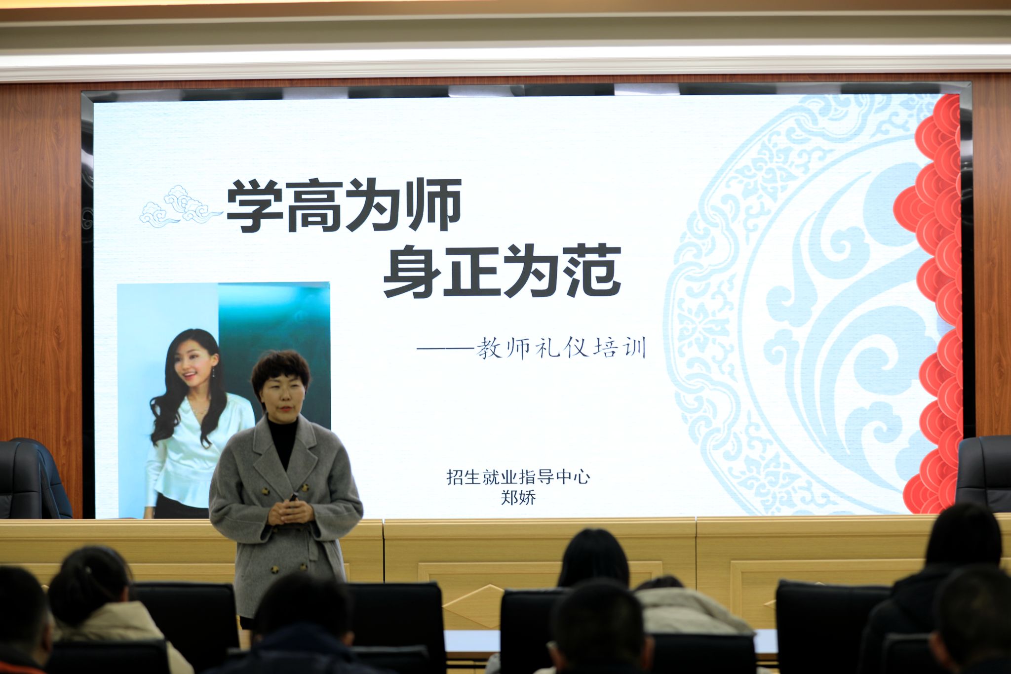 生涯发展与就业指导教研室主任郑娇老师以《学高为师,身正为范》为题,对新入职教师课堂教学活动中的仪表、仪态等进行培训。