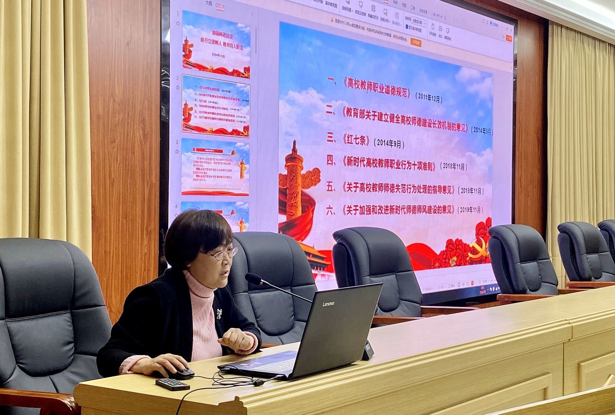 人事处刘亚砂老师以《强化师德教育 履行教师光荣职责》为题,深入剖析了师德师风建设的重要性。作为一名教师要时刻注意自己的言行举止,遵守新时代高校教师职业行为十项准则,做学生成长道路上的引路人。
