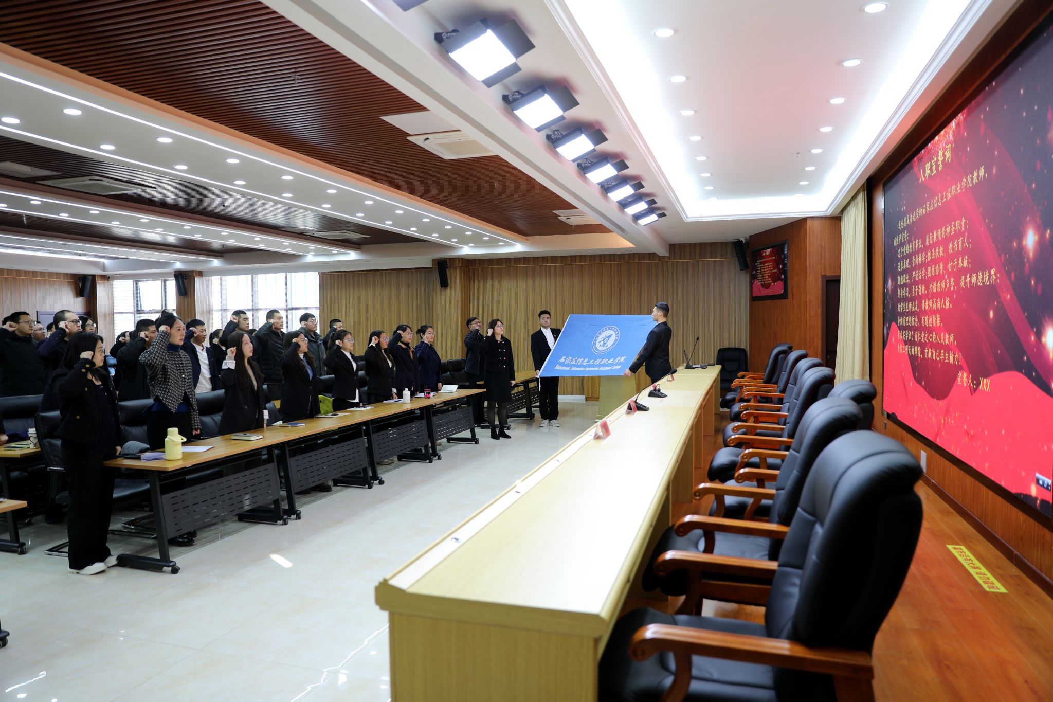 在人事处处长高平的带领下,全体新教师进行了庄严宣誓,他们面向校旗高举右拳,郑重承诺。新入职教师代表封硕发言,要做一名有理想信念、有道德情操、有扎实学识、有仁爱之心的好老师,以教书育人为己任,为教育事业献青春。