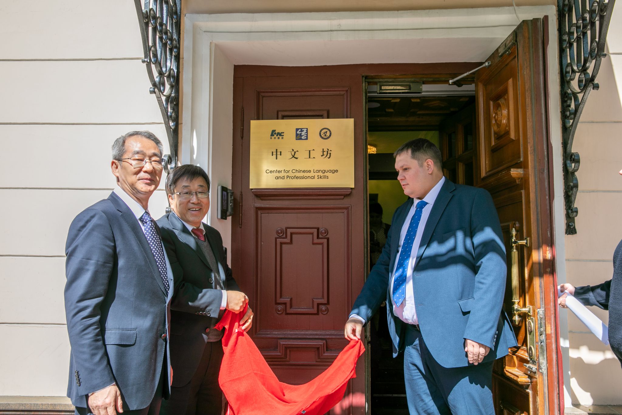 在热烈的掌声中,曹士海、马福恒、瓦伦佐夫为中文工坊揭牌。