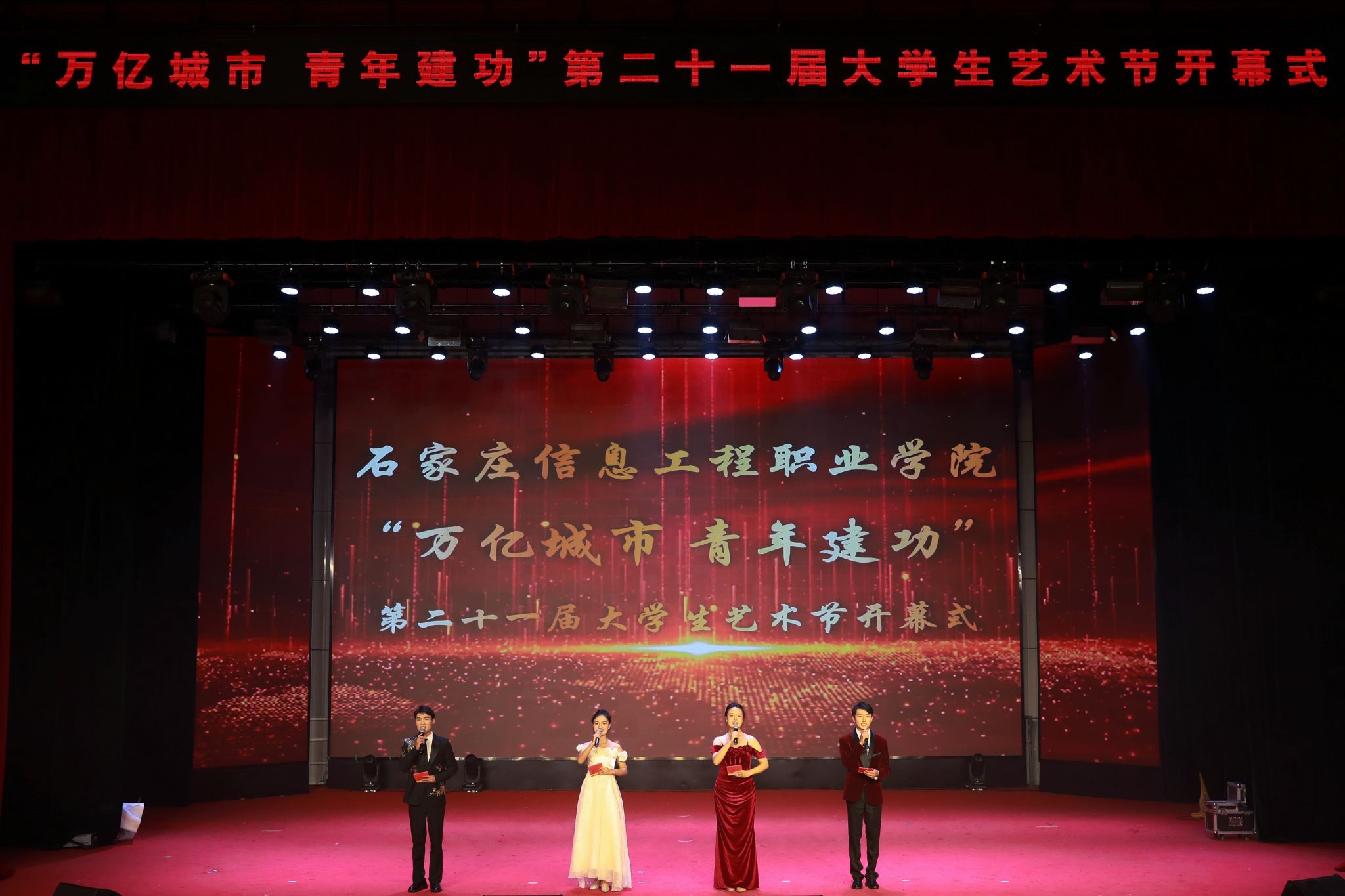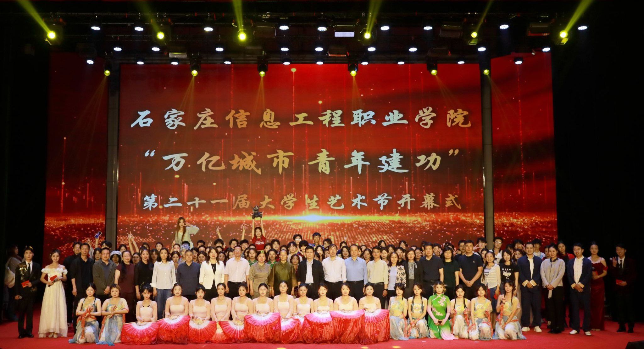 5月22日晚,昭德礼堂内灯光璀璨、掌声不断,星空(中国)“万亿城市 青年建功”第二十一届大学生艺术节开幕式隆重举行。党委书记赵立芬出席。石家庄市教育局体卫艺科科长赵玉芳特邀出席。副院长赵伟、刘占红,党委委员、工会主席王志明,党委委员、组宣部部长范成宝参加。