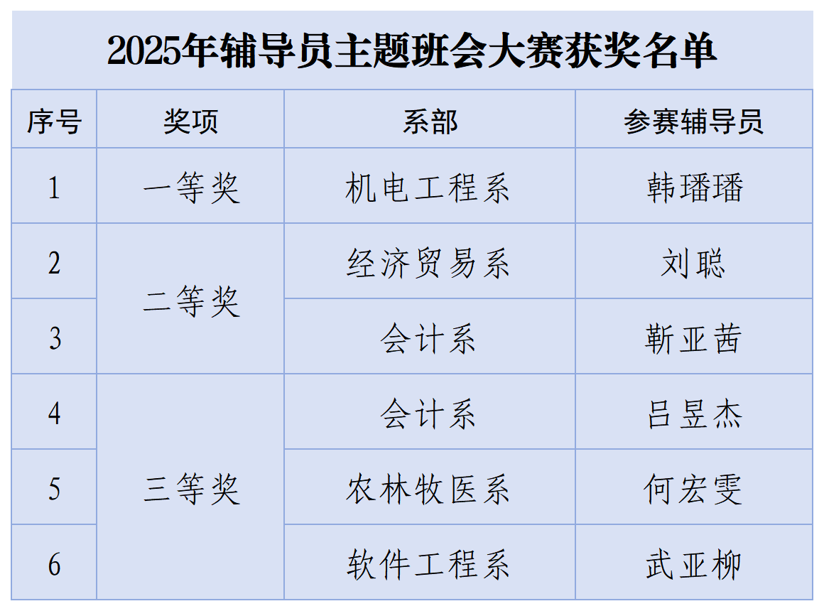 本次大赛分为网络评审和现场组织实施两个环节,在网络评审环节,评委针对选手主题班会策划书的主题、内容、环节设计等方面进行了评审;在现场组织实施环节,12名参赛选手按照策划书的设计,围绕学生日常学习生活中情绪调节、学习规划、防范诈骗、网络安全等主题,通过案例分析、游戏互动、小组讨论、角色扮演等多种形式,呈现出一堂堂主题鲜明、内涵丰富的主题班会,让同学们在轻松愉悦的氛围中学到知识,领悟道理。大赛评审委员会依据《大赛评分标准》,从教育内容、教育过程及方法、教育效果、教态与表达等方面进行了客观、公正的评审。最终,大赛评选出一等奖1名,二等奖2名,三等奖3名。