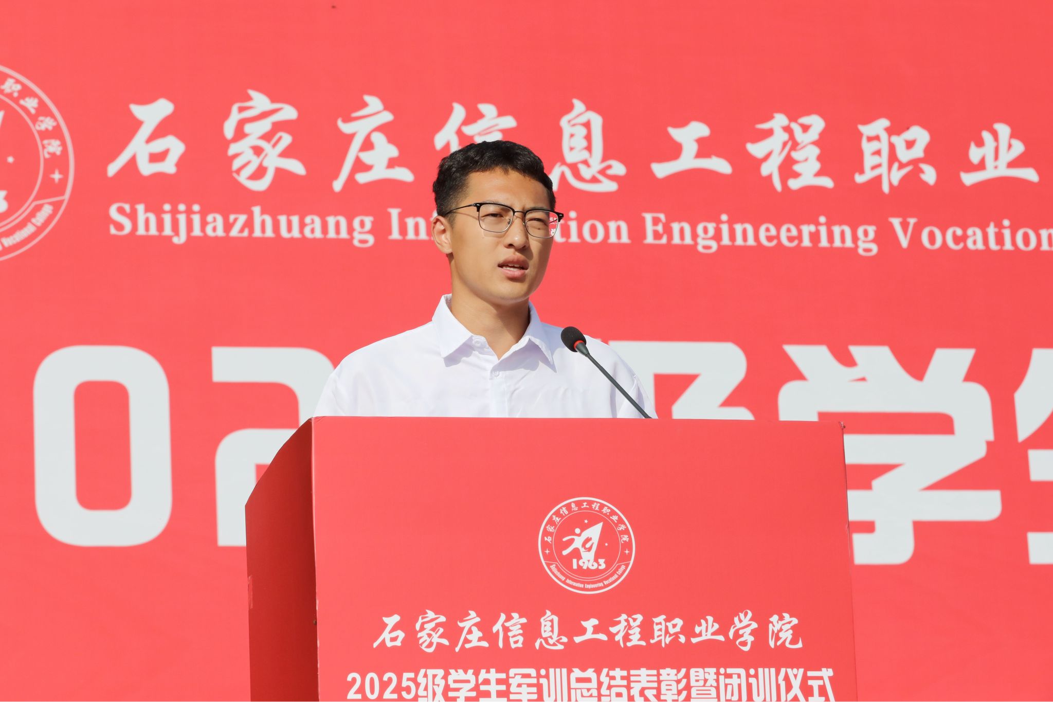 2025级信息安全技术应用3班王艺翔作为军训优秀标兵代表发言。他分享道,军训初期自己因动作生疏感到沮丧,是在教官与教师们的关怀下和同学们的努力下,步伐从凌乱到整齐,军姿从歪扭到笔挺。通过军训学会了心腹复苏的动作要领,了解了绷带包扎和三角巾的使用,了解了如何高效、规范地救助他人。也感受到了集体的温暖与力量,学会了令行禁止的纪律观念,领悟了团体协作的集体荣誉感,培养了吃苦耐劳的顽强作风,这些宝贵的品质将会成为未来学习生活中面对各种挑战的坚实基石。