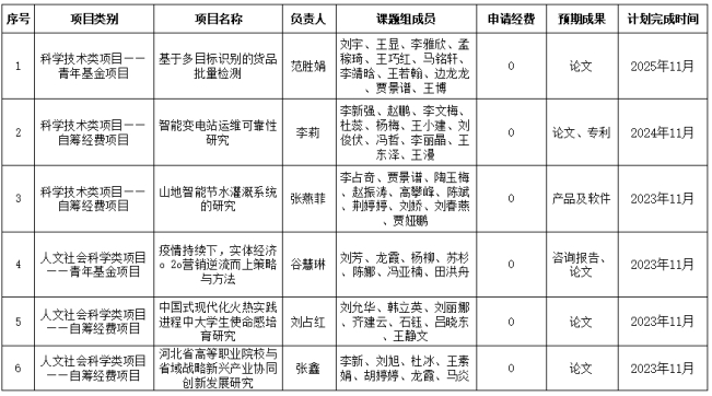自我校河北省高等学校科学研究项目申报开始,截止到10月23日,共收13项项目申请书,按照“公正、公开、择优”的原则,校内专家经过严格的评审,评选出6项优秀项目进行推荐。现对2023年度河北省高等学校科学研究项目进行公示,公示时间为:2022年10月26日至2022年10月30日。如有异议,请与科研中心联系。