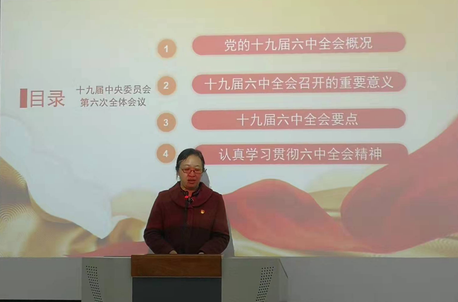 韩立英紧紧围绕党的十九届六中全会概况、重要意义、要点及认真学习贯彻党的十九届六中全会精神等方面做了详细解读,重点阐释了党的十九届六中全会为什么要总结党的百年奋斗的重大成就和历史经验,分析了全会提出的一个“号召”、两个“确立”,总结了中国共产党百年历程上的四个“伟大成就”、五大“历史意义”、十个“经验”,明确全党要坚持唯物史观和正确党史观,牢记中国共产党是什么、要干什么这个根本问题,坚持用马克思主义的立场、观点、方法观察时代、把握时代、引领时代,永远保持同人民群众的血肉联系,践行以人民为中心的发展思想。
