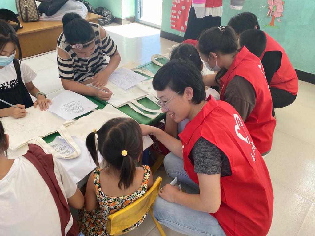 “筑美乡村 艺路向阳”社会实践小分队立足于专业特长在东纪城村开展了文化下乡活动,以书法、绘画、剪纸艺术为载体,组建文化美育小组。系部书法社成员组成的“翰墨书香”小组教小朋友们学写毛笔字;具有绘画特长、设计特长的师生们组成 “彩绘DIY”小组,指导小朋友们在白色帆布袋上绘出“梦想”;王丽云剪纸技术技能大师工作室成员组成“剪纸颂党恩”小组,教小朋友们学习团花和党徽的剪法。通过学习传统文化艺术知识,并动手实践文创作品,加深了孩子们爱党爱国爱家乡的情怀。同时,各小组为该村留守儿童发放学习及体育用品,围绕学业辅导、健康教育等内容进行了互动。