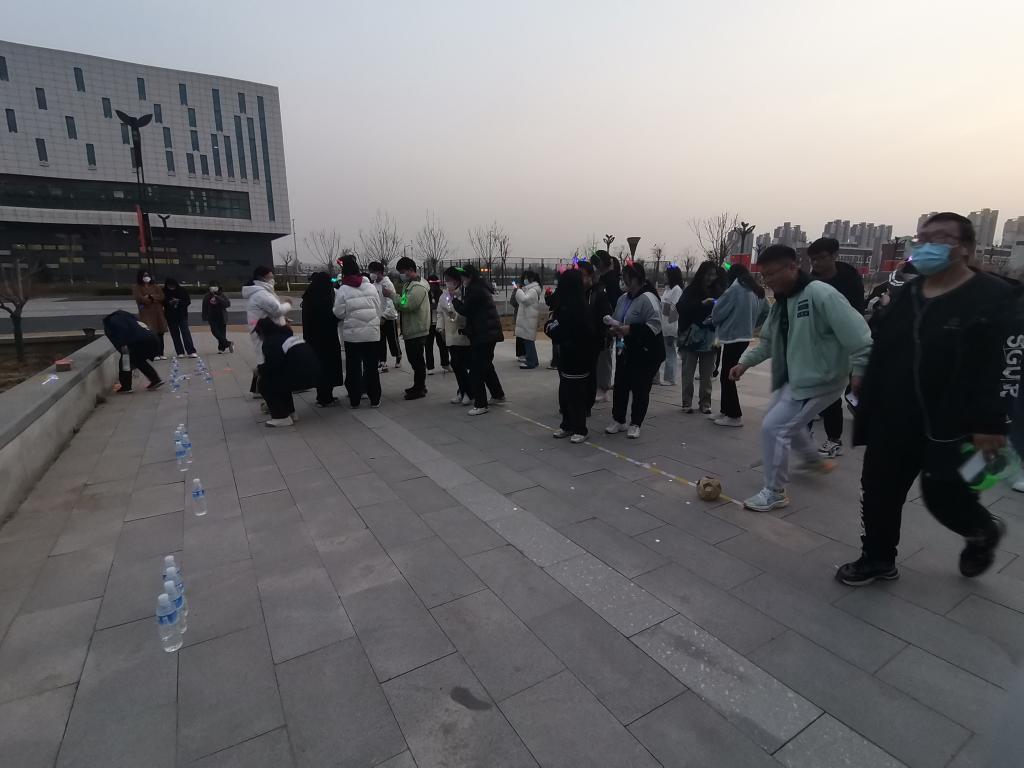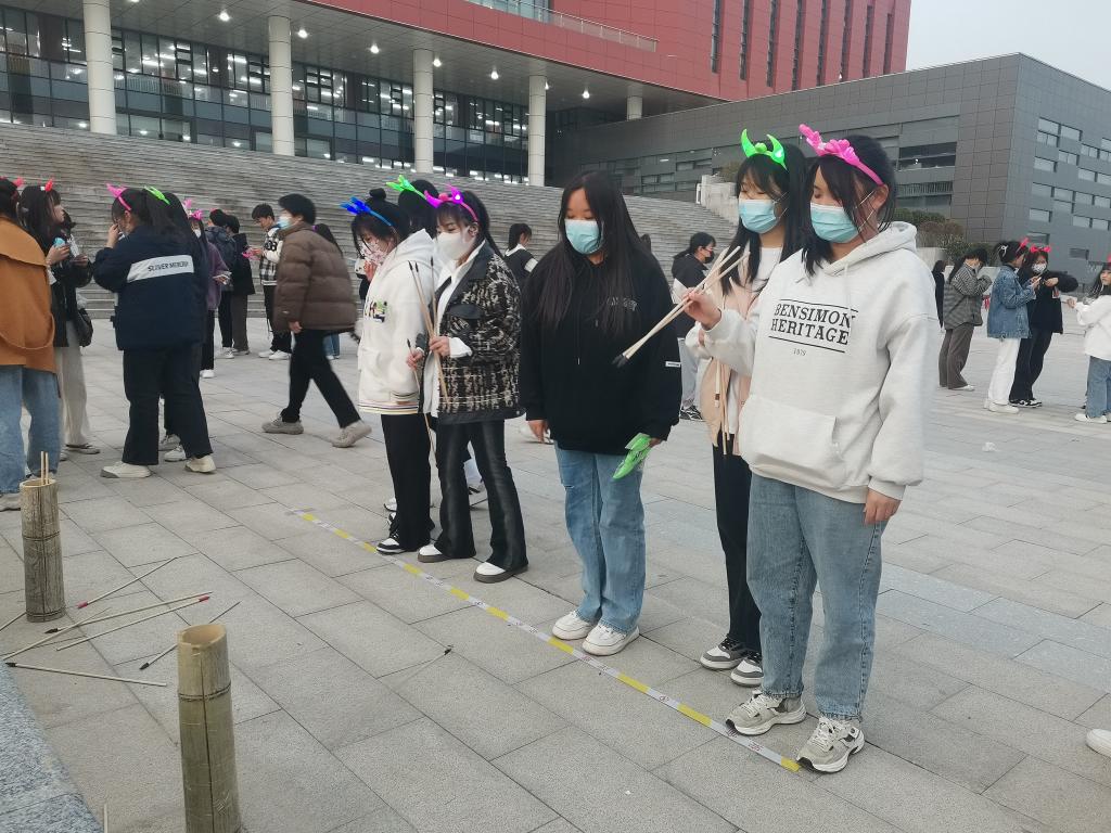 荧光夜走开始前,图书馆广场前就排起了长长的队伍,师生签到后领取发光头饰、荧光棒和手环,并一起热身,活动手腕、脚腕,防止夜走过程中出现意外情况。本次夜走活动还设置了六个传统体育项目,如蹴鞠、投壶、射箭等,参与者通过夜走和体育游戏积攒印章,可以换取心仪的奖品。