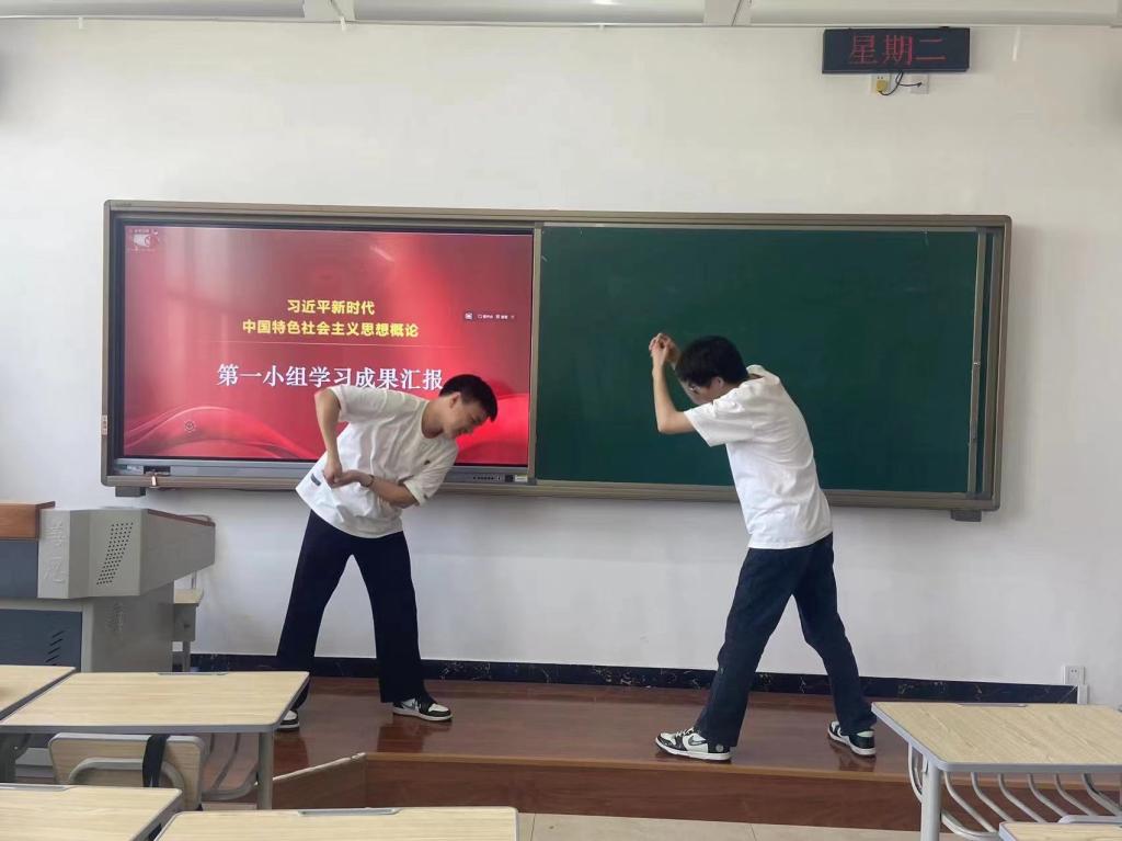 同学们以学习小组为单位,自主选题,设计场景,以情景剧、小品、三句半、相声、皮影戏、音乐剧、手势舞、诗歌朗诵等多种“路演”形式在课堂上进行汇报。学生热情洋溢,课堂氛围热烈,内容紧跟时代,主题鲜明,同学们用自己的方式诠释了对中国式现代化、中国梦、生态文明、乡村振兴等课程内容的深刻理解。