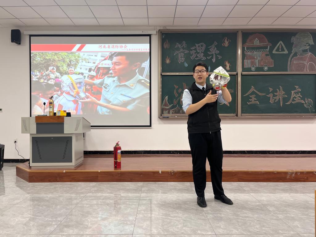 消防讲座中,河北省消防协会孙浩天教官结合全国典型火灾案例,运用视频案例,深入浅出地讲解了消防安全工作的重要性,着重对火灾的基本常识、常见的火灾隐患、日常防火措施、火场逃生自救、灭火器使用方法等消防知识进行了详细阐述,全面介绍了日常生活中应注意的消防安全细节。台下同学们目不转睛,认真听讲,积极提问,深刻认识到了日常防范的重要性以及掌握消防安全知识的必要性。