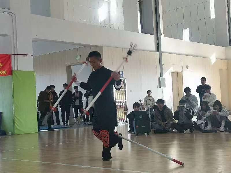 河北省吴桥县是驰名中外的“杂技之乡”,有着悠久的杂技历史和深厚的文化底蕴。活动中,省级“非遗”项目飞叉杂技第四代传承人彭立新老师带来了精彩的飞叉表演。飞叉表演始创于明清两代也是武术十八班兵器之一,使用装有活络环形铁片的钢叉,使之在肩、背、胳膊等处滚转,或抛掷空中,然后接住,耍出各种花样,有攻防技击之用。随着飞叉高速旋转,彭立新臂上、腿上、肩上、腰部和胯下翻转滚动飞叉,做出单超、双超、过脑、发高、骗马、背花、过桥、怀中抱月、插花盖顶等动作。飞叉循环飘飞,花样繁多,有声有色。