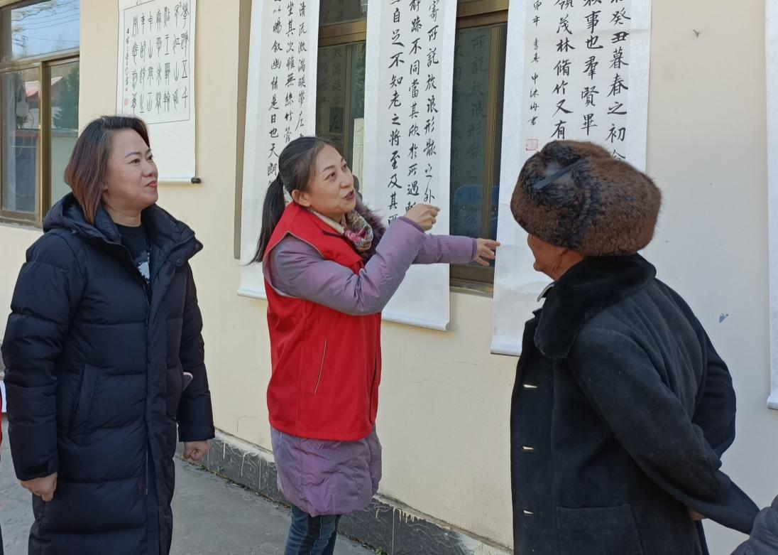 为助力美丽乡村建设,美化乡村环境,丰富村民精神生活,传播汉字书法文化,小分队组织了“文化进乡村书画展”。活动邀请村民欣赏书法作品,小分队成员为村民讲解各种字体的鉴赏知识。体正势圆的篆书、刚劲挺拔的楷书、潇洒飘逸的行书……为山村增添了文化气息,让村民感受到书法艺术之美。