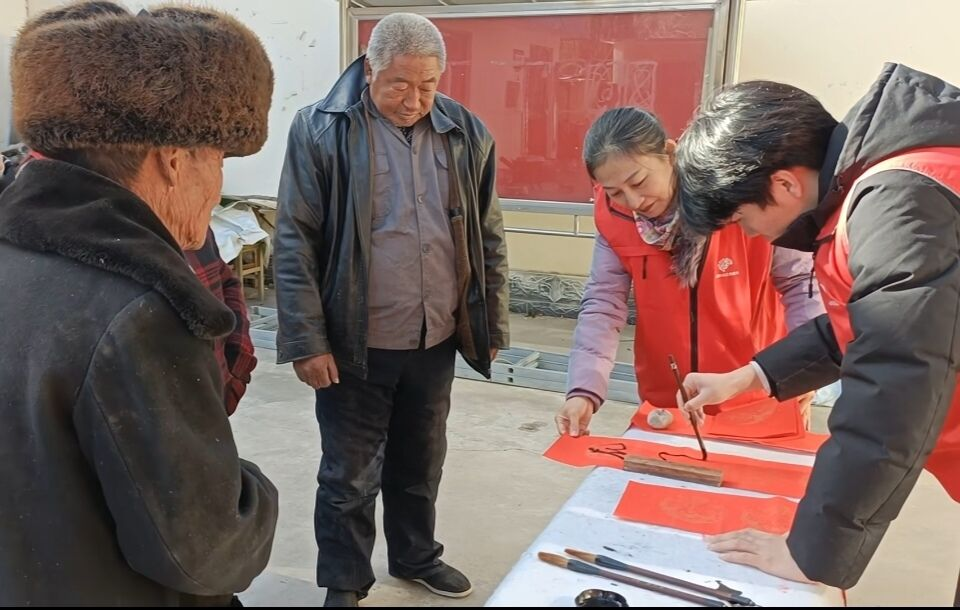 随后,小分队的同学现场为村民书写了春联。春联作为汉字书法的重要呈现形式,是民俗文化的载体,承载着人们对幸福生活的美好期盼。春联内容有“福星高照”“平安喜乐”“鸿福满堂”等,红红火火的春联为冬日的山村添了一抹暖色。