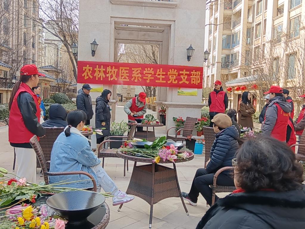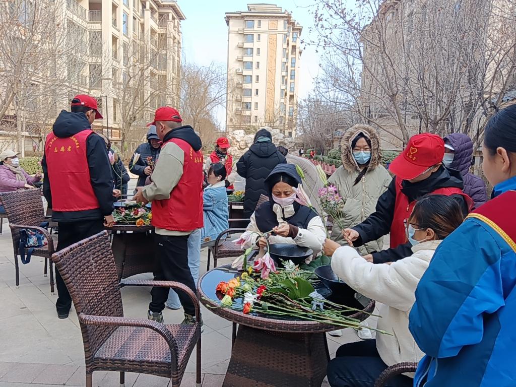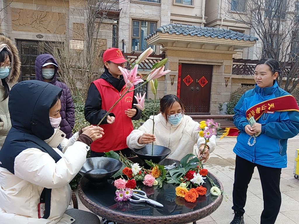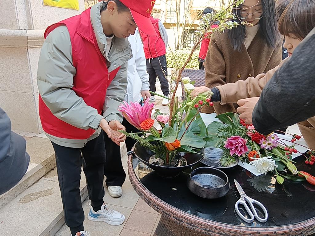 志愿者们向社区居民、工作人员致以亲切的问候并开展插花活动。园林教研室教师向大家讲授了东方插花艺术特点及插花艺术的要点,志愿者根据所听所学,围绕插花艺术的基础知识、工具使用、插花造型、色彩搭配等对现场的社区居民进行详细讲解和指导,并与社区居民分享色彩、形态、寓意、香味等花卉常识、花枝护理方面知识。社区居民纷纷加入到这场充满创意与乐趣的活动中,在志愿者的指导下亲手挑选花朵,搭配色彩,制作出一束束独属于自己的鲜花。现场氛围其乐融融,充满欢声笑语,大家以饱满的热情沉浸其中,活动成为了一个真正的学习与交流的平台。