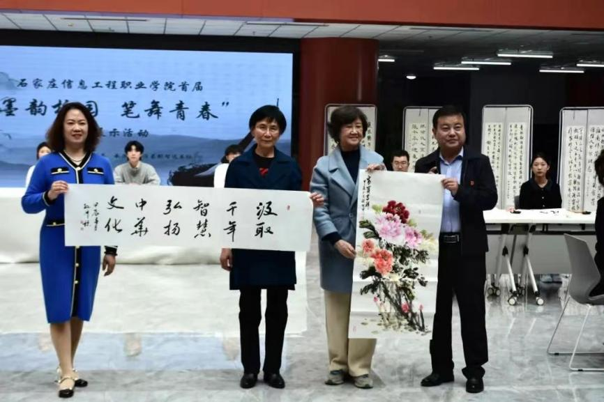 张锐明老师为展示活动赠送画作“牡丹”,孙淑稳老师现场题字,恢宏有力地写下:“汲取千年智慧,弘扬中华文化。”行云流水,意蕴深长,将活动氛围带向高潮。这份厚重的礼物不仅代表着专家对本次活动的支持和肯定,更充满着对同学们的殷切期望。