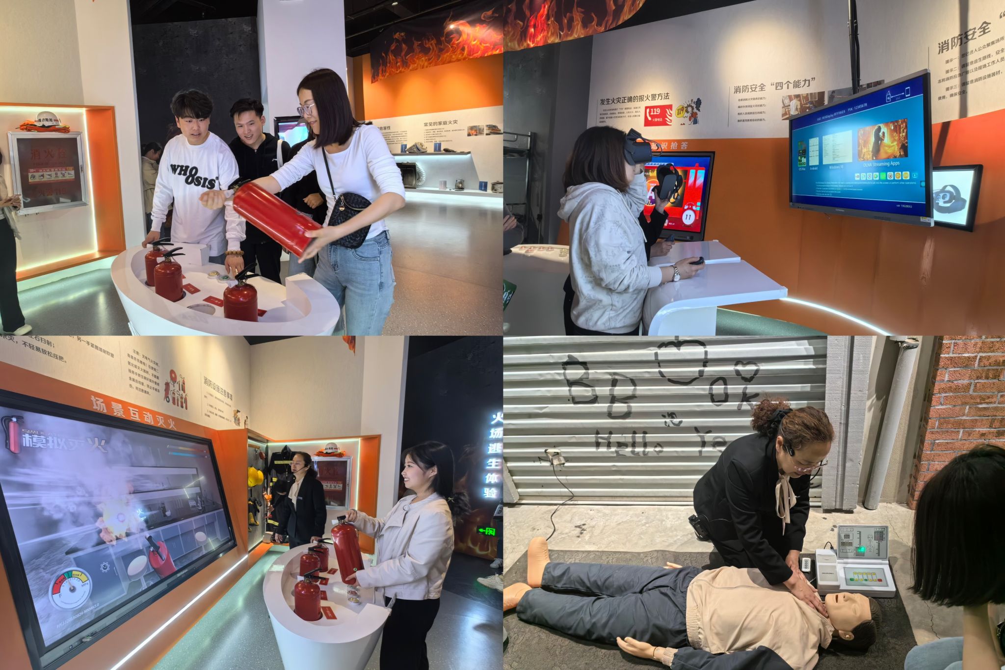 活动现场,在讲解员的带领下大家依次参观了国家安全、自然灾害安全、消防安全、交通安全、实验室安全等五个专题展区,体验了知识竞答、地震震感、碰撞体验、模拟灭火、火场烟雾逃生等互动感应装置,并学习在突发状况下如何进行有效心肺复苏救援、外伤处理,如何正确使用灭火器材,在发生火灾、地震等紧急情况下如何进行逃生自救等常用应急技能。这种互动体验、实景模拟的方式,让师生们身临其境地参与模拟场景,亲身观察和体验各种突发安全情况,切身体验了安全的重要性,在寓教于乐中学到了安全知识。