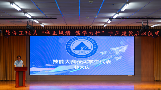 技能大赛获奖学生代表林大庆、优秀学生代表刘硕分享了学习和参赛的感悟和心得。优秀毕业生代表通过视频发来寄语,鼓励学弟学妹们珍惜时光,努力学习,不断进取。