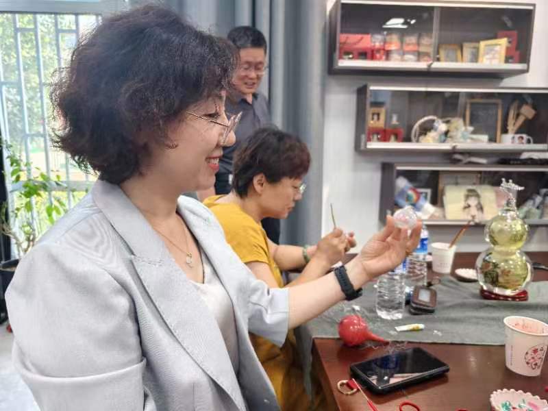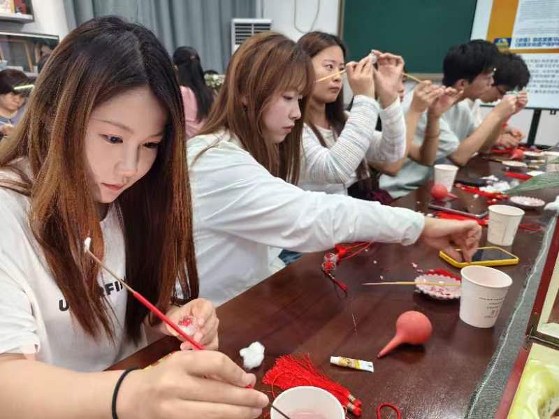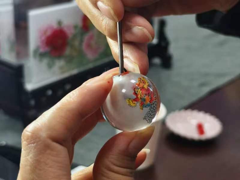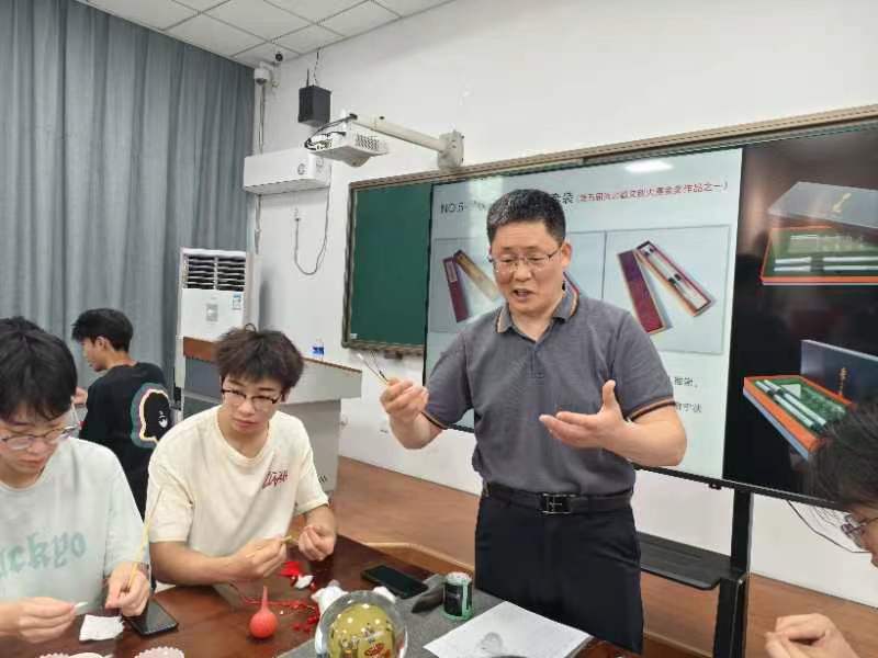 首场活动邀请的是河北省省级非物质文化遗产内画技艺代表性传承人、“河北省突出贡献技师”、“河北省最美农民工”、“沧州市大工匠”、省级技能大师工作室领办人尹庆元入校交流。尹老师详细介绍了肃宁内画的历史脉络、传承现状,展示了内画文创产品从设计到研发的过程,并手把手教学,带领师生按照内画绘制流程完成了内画小挂饰的制作。