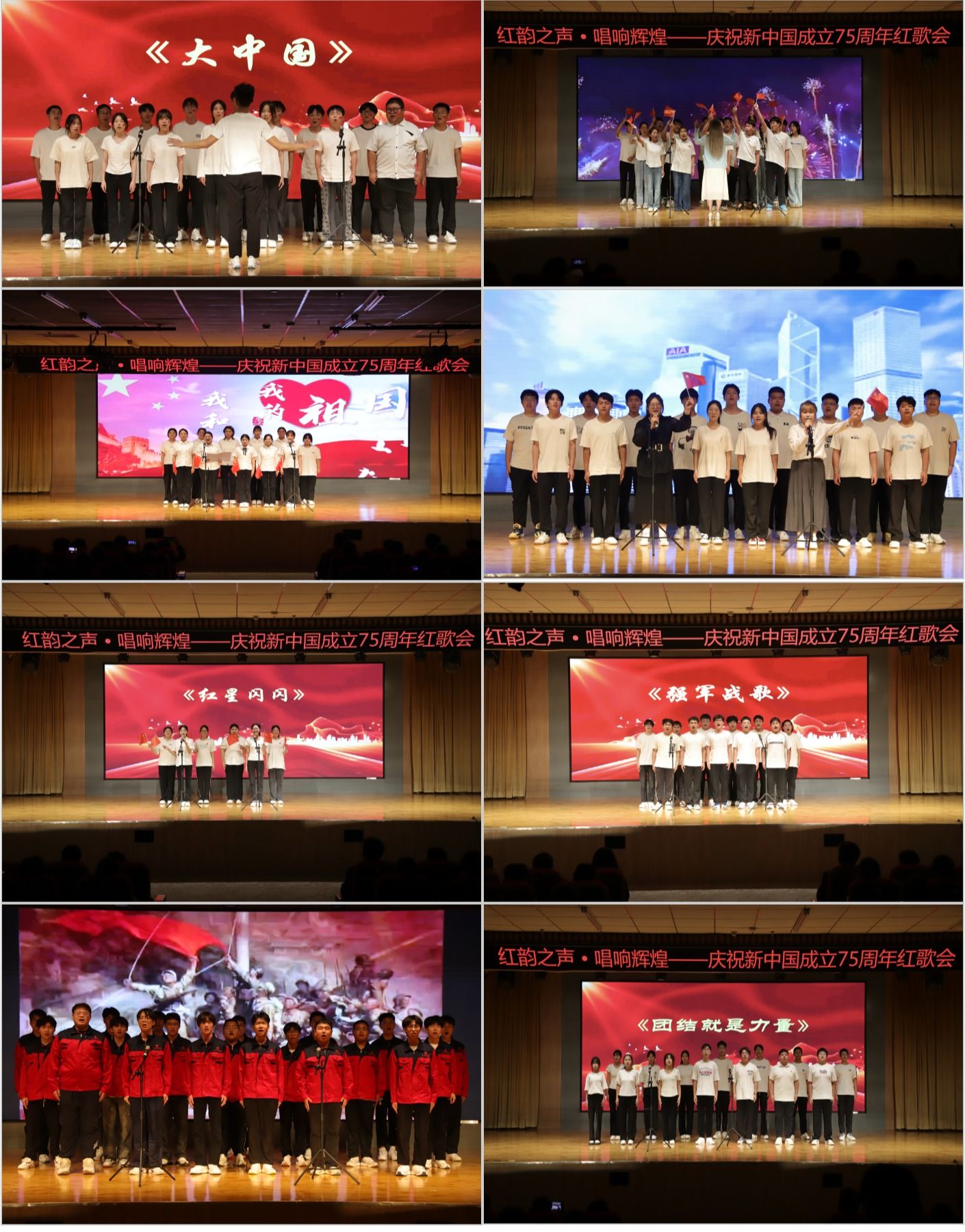 活动现场,灯光璀璨,气氛热烈。《大中国》《歌唱祖国》《我和我的祖国》《我爱你中国》《红星闪闪》《强军战歌》《团结就是力量》.......一首首耳熟能详的红色歌曲在报告厅内回荡,无论是慷慨激昂还是娓娓道来,每一句歌词都饱含着青年学子对祖国的深情厚谊和以青春之我担当时代使命的坚定决心。