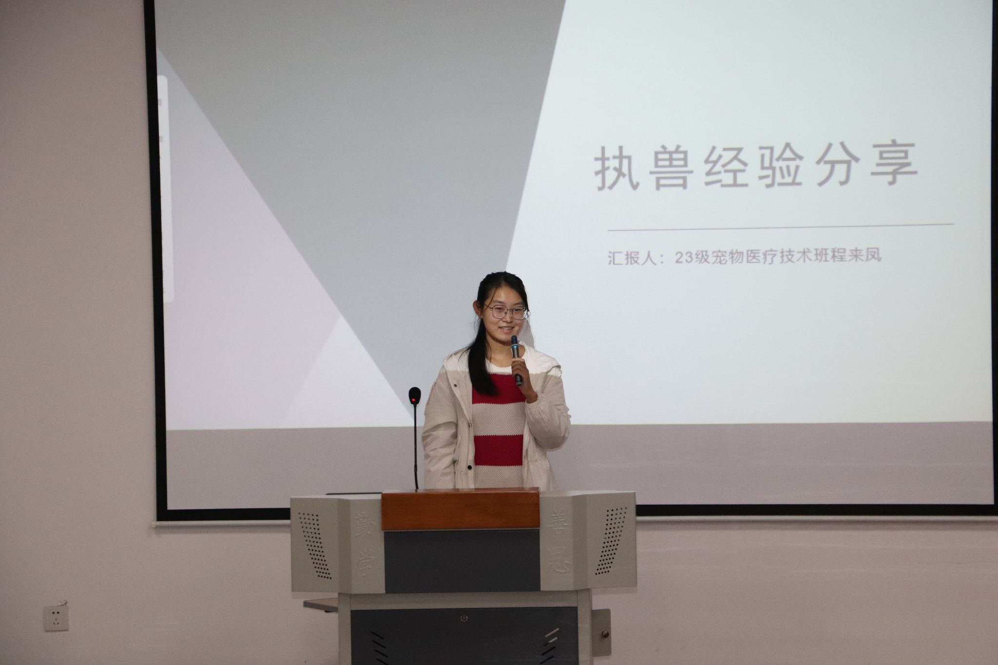 22级、23级徐浩、潘积信等八名通过执业兽医师资格证考试的学生代表,结合自己的学习技巧和备考经验,详细介绍了资格证考试的科目、形式和重点,讲解了基础、临床、预防、综合四科考试涵盖的主要内容,分享了学习经验,在备考过程中遇到的困难以及如何应对等方面内容。最后,八名学生代表与同学们进行了现场互动,对在场同学提出的问题进行了详细解答,现场气氛热烈,同学们热情高涨。