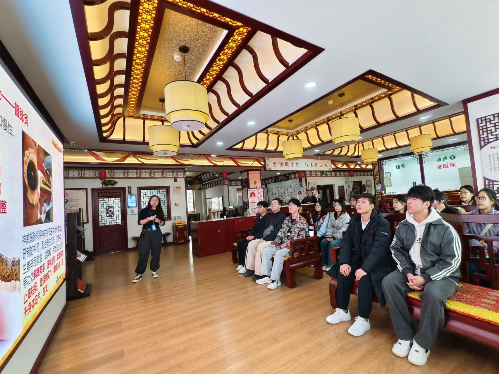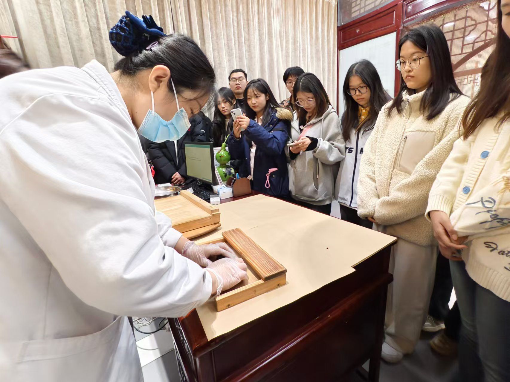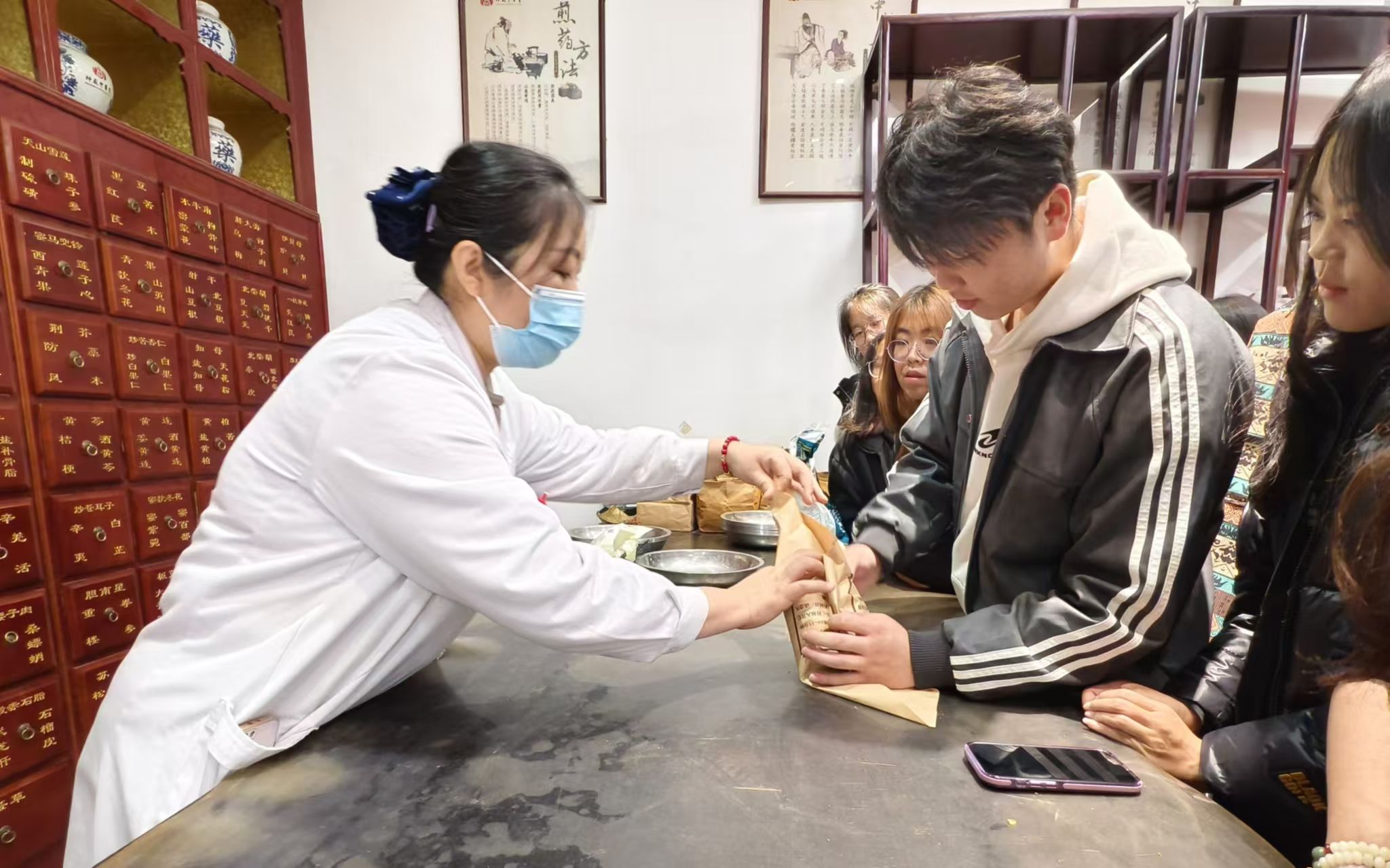 工作人员带领师生们参观了中医堂的各个楼层和科室,了解了常用的20多味中药名称和主要功效。在实操环节,同学们仔细观察王老师的动作,生怕漏掉一个技术要点,随后还体验了中药包的打包方法和丸剂的制作过程,吃膏方,喝药茶,沉浸式领略中医药文化的魅力。