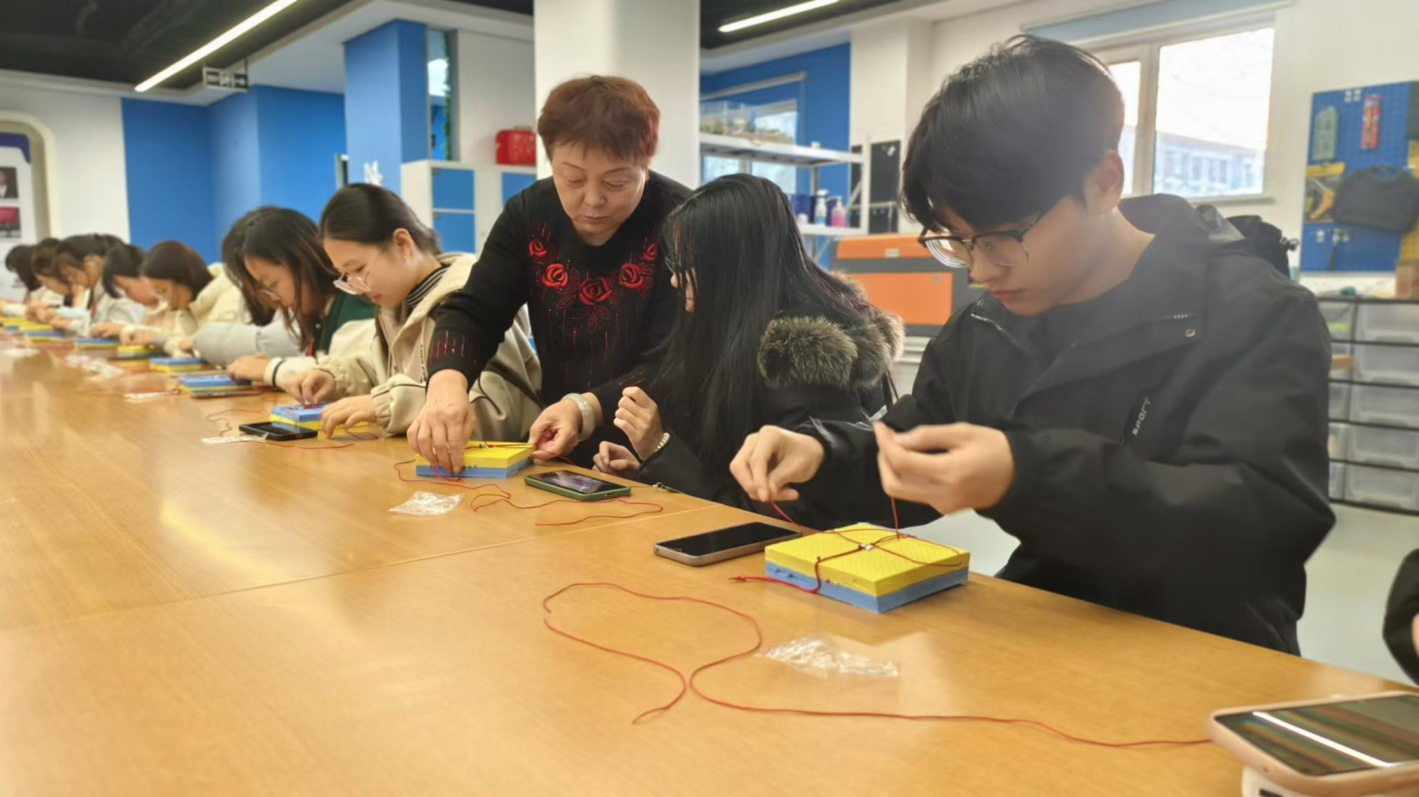 本次志愿服务队邀请绳编技艺传承人李庆荣老师带师生体验平结手链的编制方法。李老师先向大家展示了式样各异的“中国结”,有单个的、成对的、拼接的……她以平结为例,示范翻绕压挑流程。平结是最古老、最通俗和最实用的结索。“平”有高低相等,不相上下之意,同时,又有稳定的含义,给人四平八稳的感觉。平结由于编结的方法不同,可以分为单向平结和双向平结。本次课程学习的是呈螺旋上升状的单向平结手链。