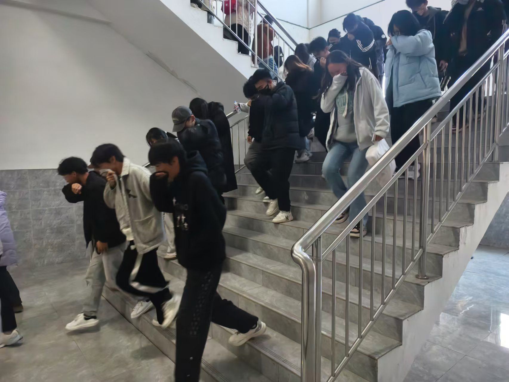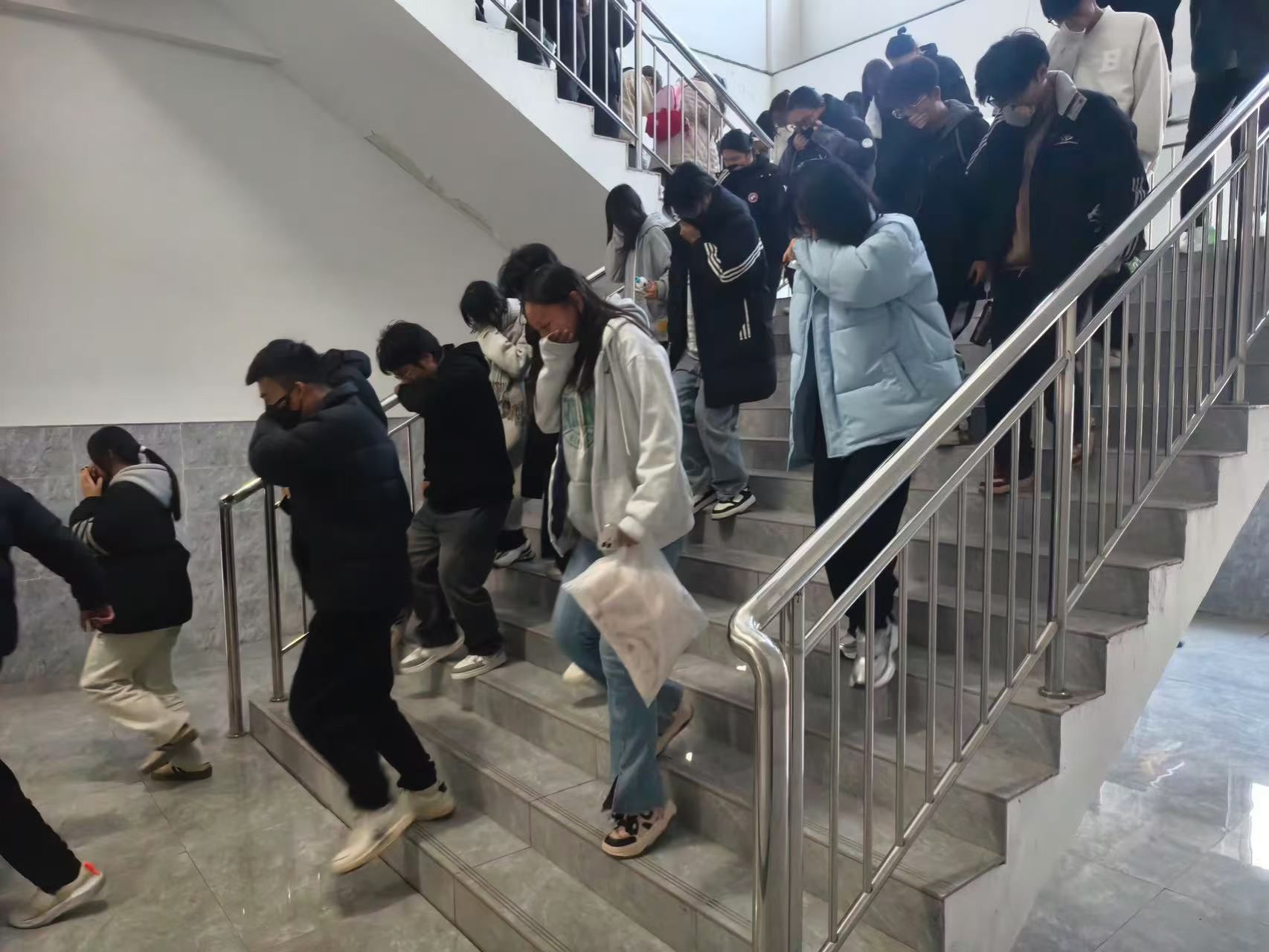 讲解结束后,在场师生进行了消防演练。警报拉响后,大家迅速响应,学生们在老师的组织下用湿毛巾捂口鼻、弯腰低姿,按照预定路线有序撤离教室,快速到达安全区域。