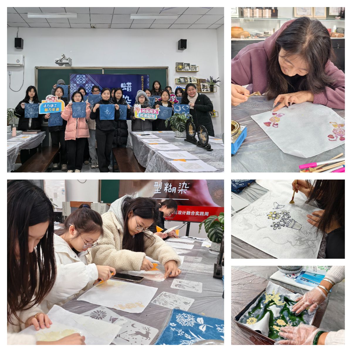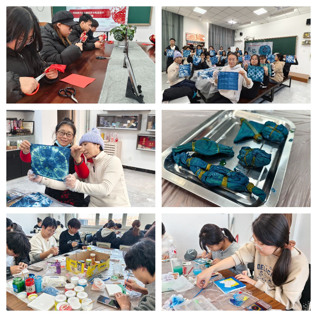 《构成设计》作为传媒艺术系学生的专业基础课程,在初学者设计入门时起着极其关键的作用,其以图形造型、色彩搭配、整体构造为主要学习内容。针对平面构成、色彩构成和立体构成三部分内容,工作室精选剪纸、石影雕、蜡染、扎染、型糊染、绘画等多项技艺融入《构成基础》等课程,将点、线、面要素进行合理组合,构成新的图形;通过学习色彩的明度、纯度、色相和对比所产生的不同效果,深层地了解色彩所带来的魅力;又通过变形和重组等进行设计再创造。